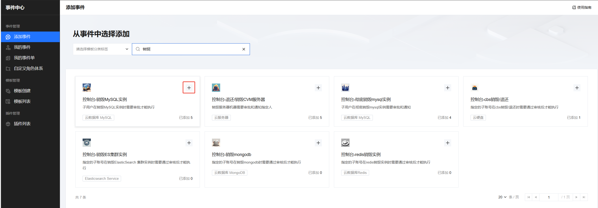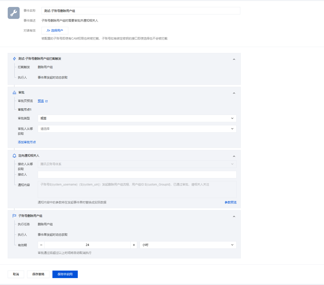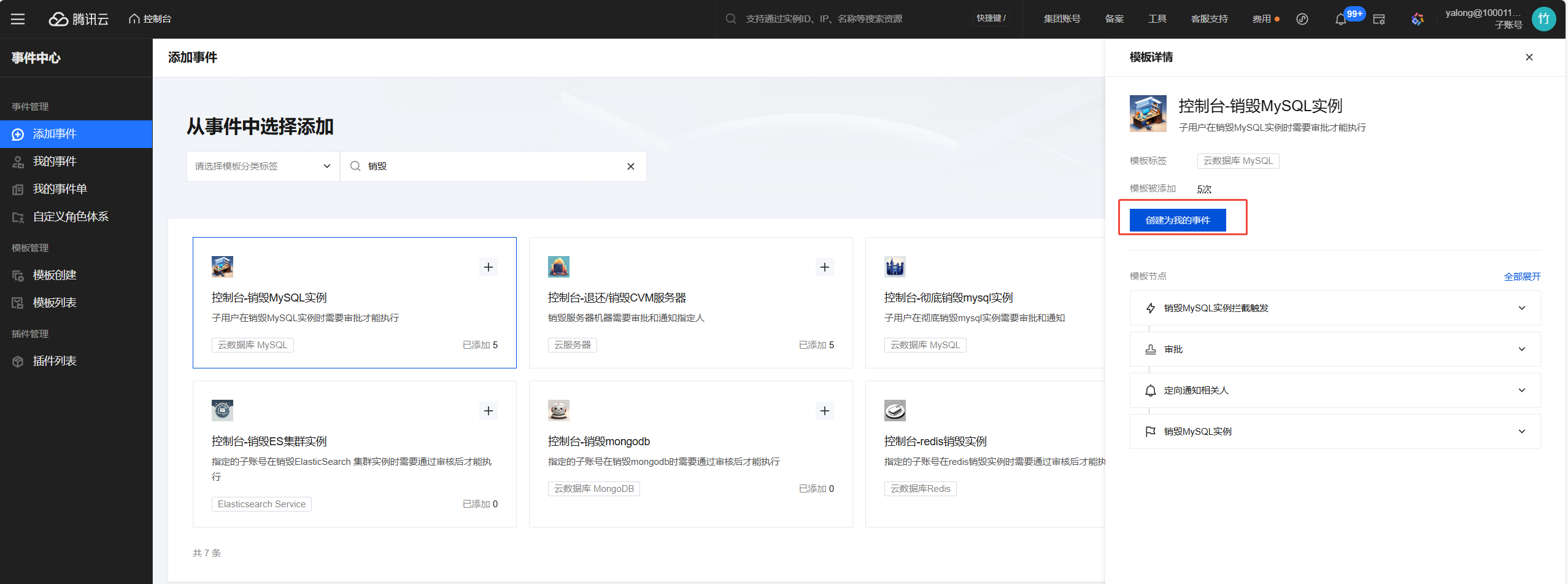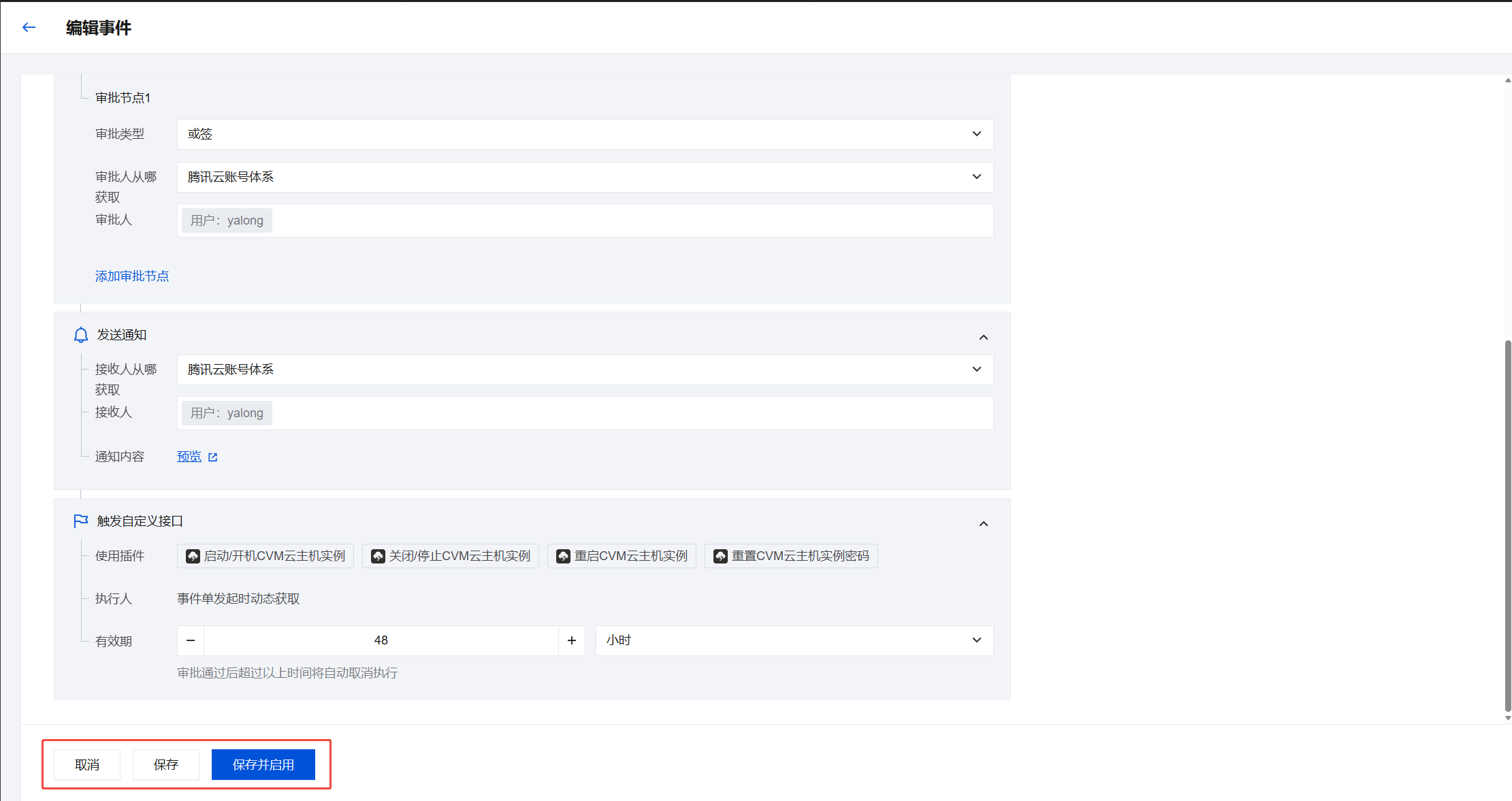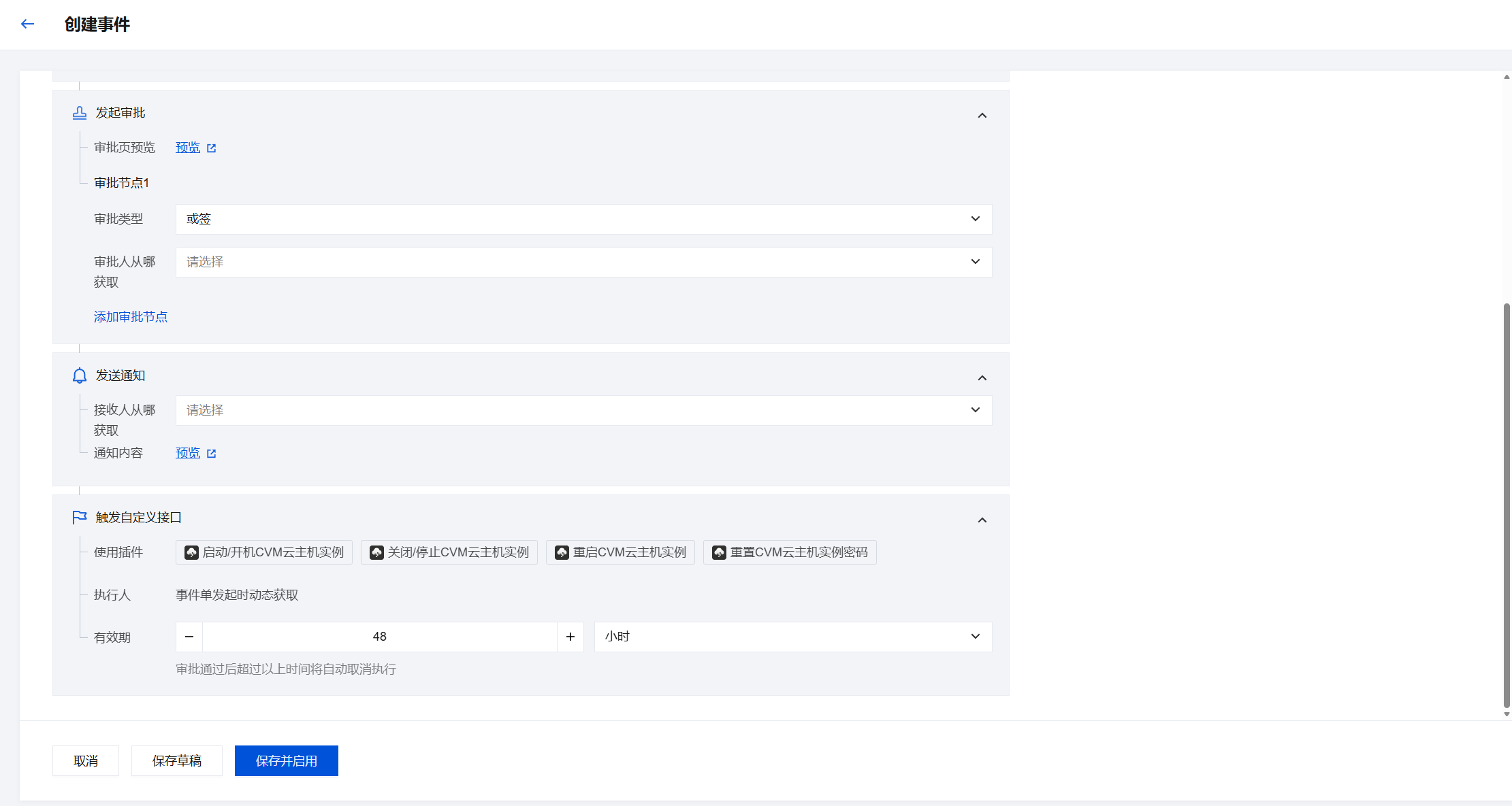 多个操作场景事件:以 CVM 产品为例,如果需要管控账号在启动 CVM 主机实例、关闭 CVM 主机实例、重启 CVM 主机实例等多个操作场景时均需要触发审批,且审批人相同时,则属于多个操作场景事件;可以搜索“触发自定义接口”模板创建事件。