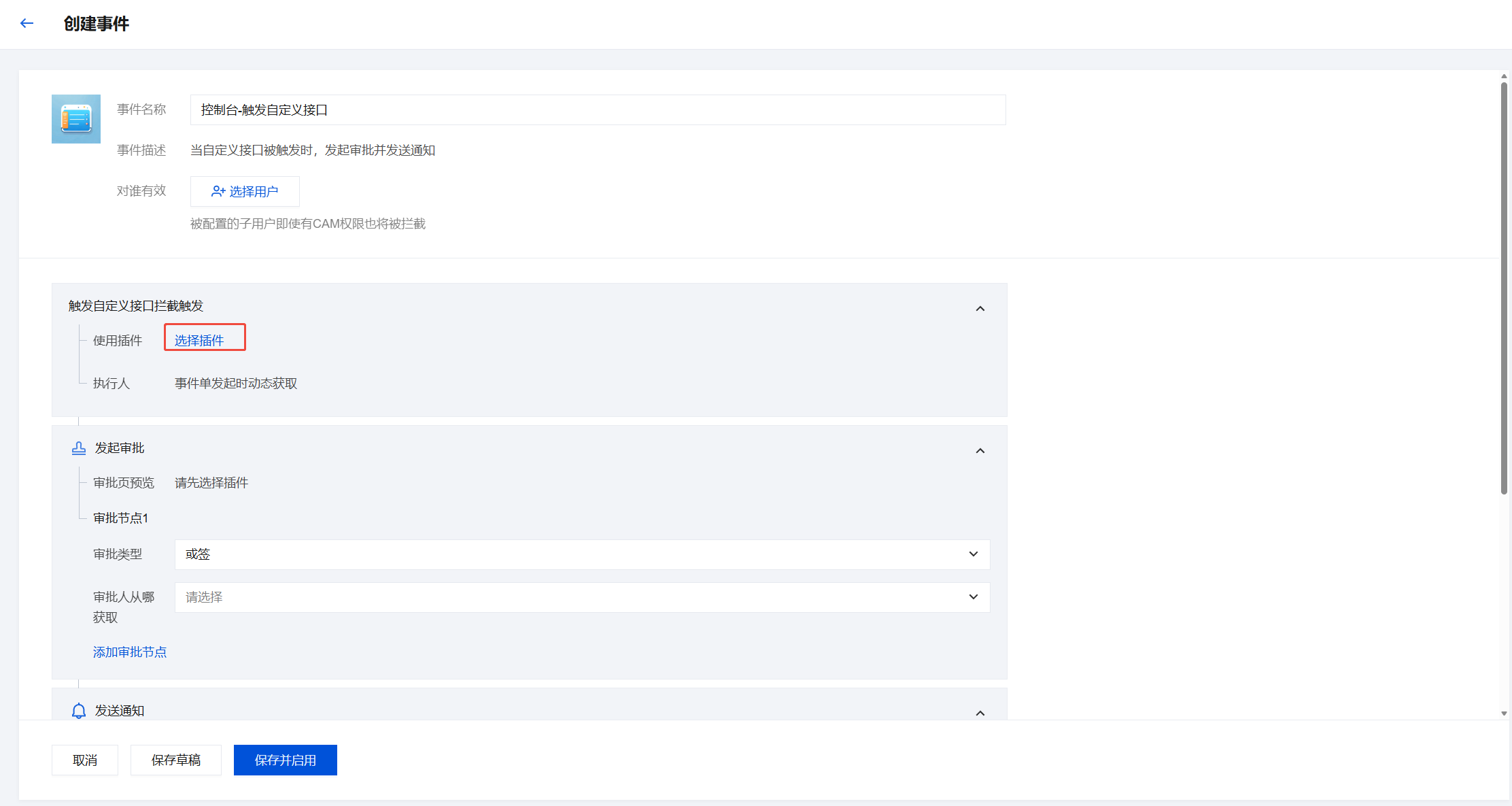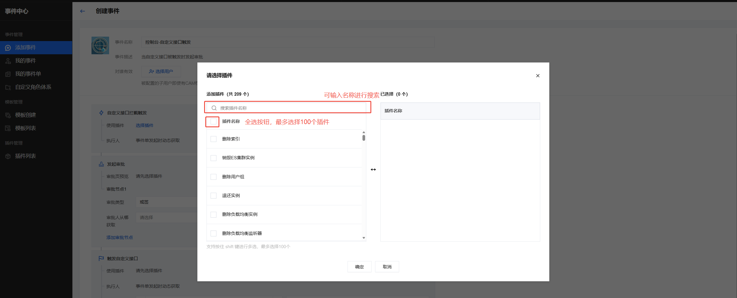 进入到创建事件页面,触发自定义接口拦截触发节点,单击选择插件后,可以在插件选择列表中进行选择,支持多选以及搜索插件,每个事件最多选择100个插件;