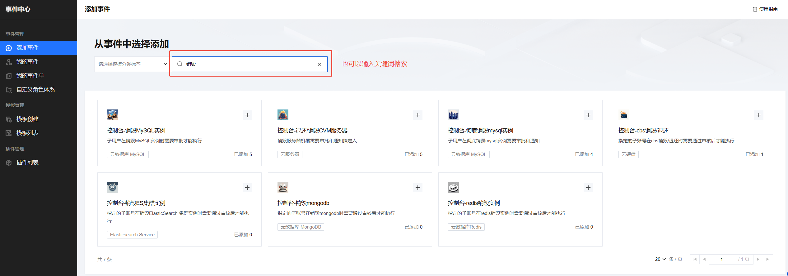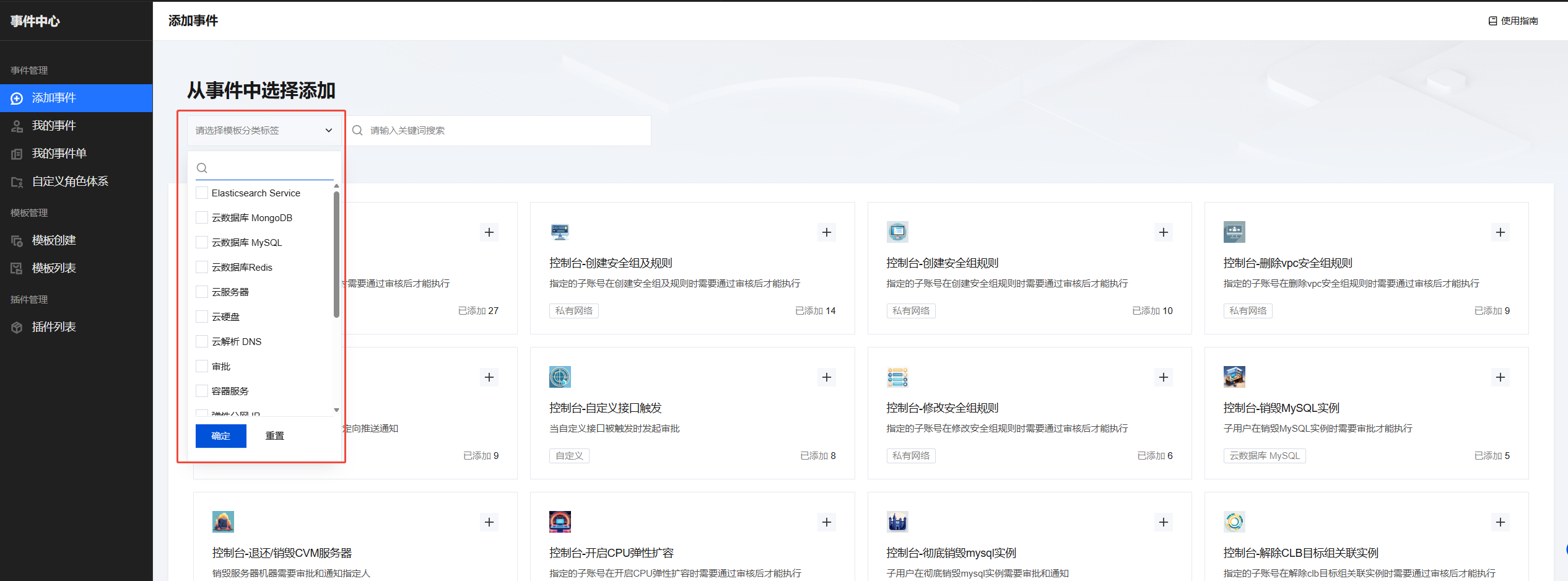 支持通过选择模板分类标签筛选,或输入事件名称/事件编码关键词模糊匹配搜索