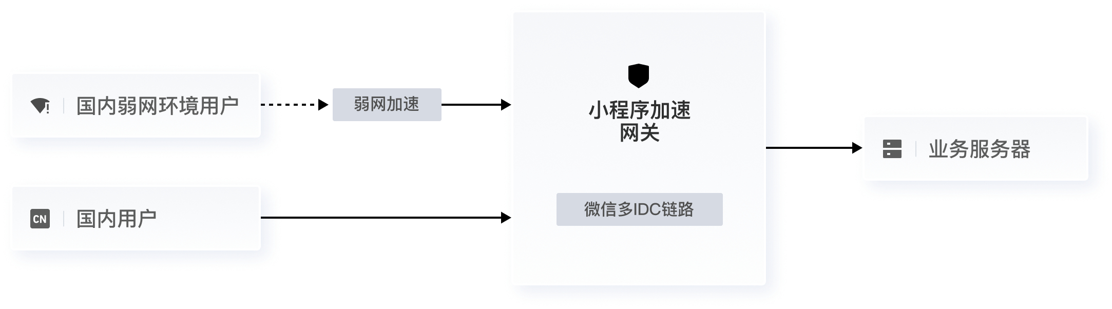 在线购物中,用户请求来自弱网环境中,导致无法打开小程序,无法完成支付,影响用户购物体验,也影响业务的营收。小程序加速提供就近接入、网络加速能力,使用微信多 IDC 链路,有效优化三四线城市及商场等弱网环境访问质量,只要微信能打开,业务小程序就可以使用,用户可以完成商品选购和支付,显著提升客户端访问成功率及用户购物体验。