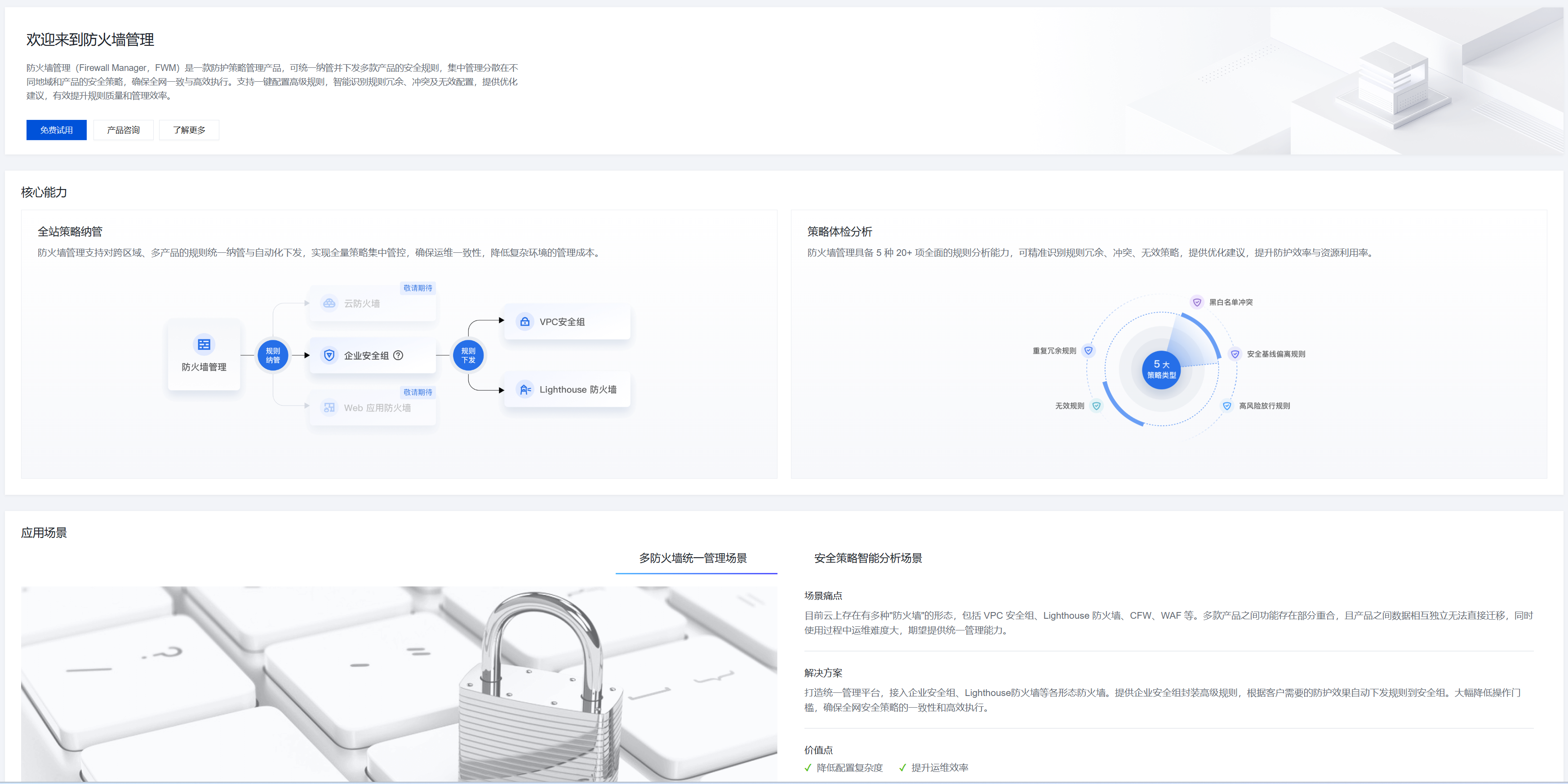 本页面旨在向您介绍防火墙管理的产品定位、核心价值与应用场景。您可在此页面一键申请免费试用,快速开启集中式安全策略管理体验。
