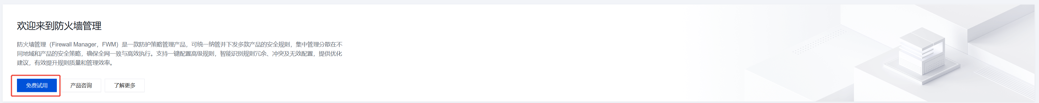 当您首次访问防火墙管理且未开通服务时,控制台将显示本欢迎页。