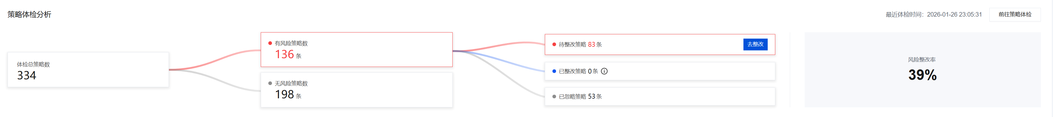 查看上一次策略分析体检的执行完成时间,以及体检总策略数、有风险策略数、待整改策略、风险整改率等关键结果。