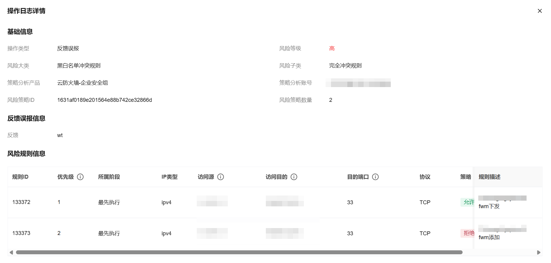 查看反馈误报行为的日志详情时,可查看对应风险的基础信息、反馈误报信息以及对应的风险规则信息。