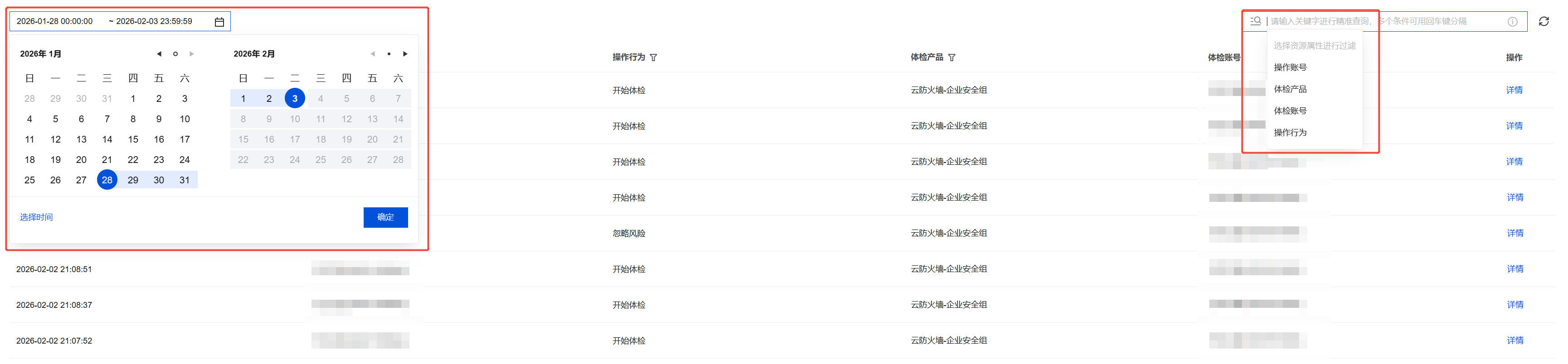 4. 您可以通过选择时间范围,并组合选择多种资源属性(如操作账号、操作行为等)进行精确查询,以快速过滤出目标记录。