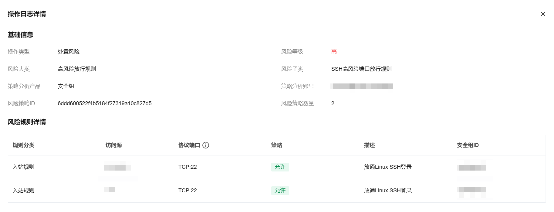 查看忽略风险、处置风险以及取消忽略行为的日志详情时,可查看对应风险的基础信息及对应的风险规则信息。