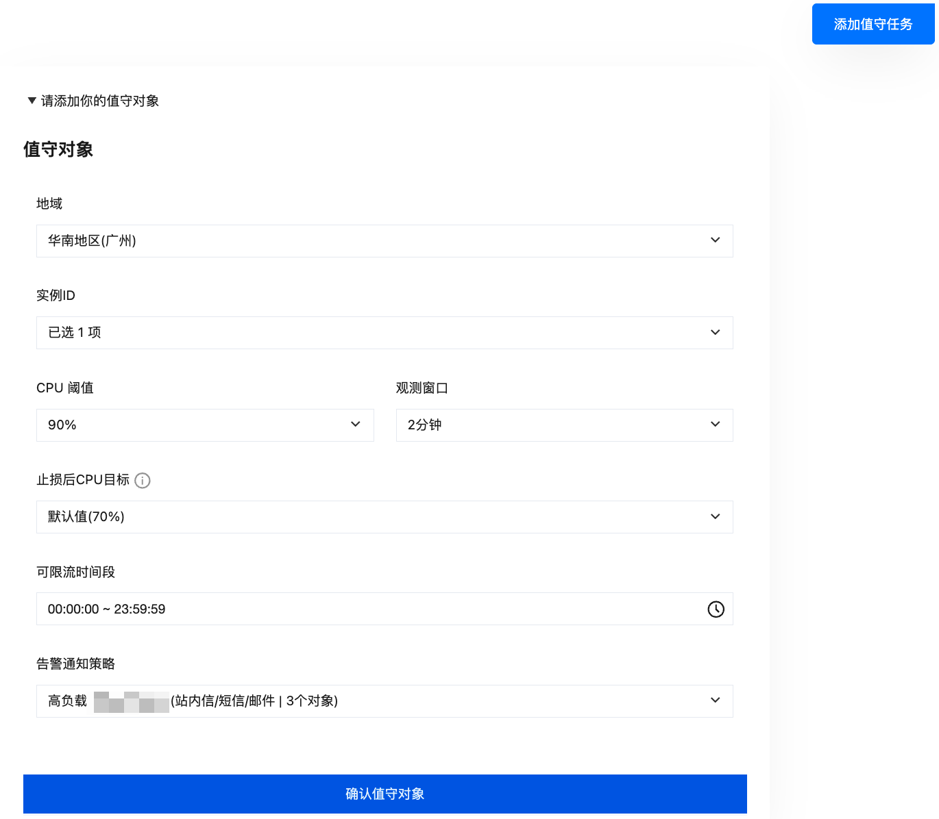 5. 配置任务参数,配置完成后单击确认值守对象。