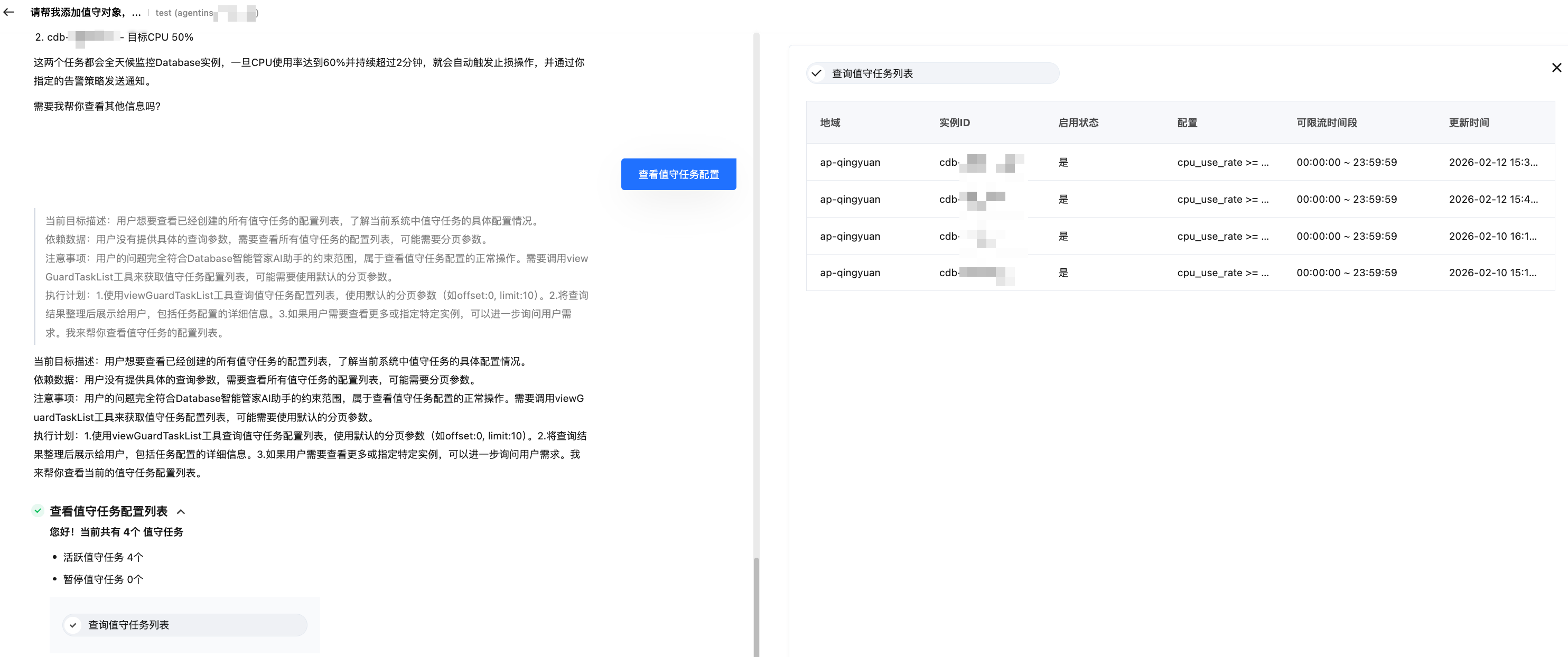 在对话窗口单击查看值守任务配置,在右侧页面查看当前活跃的值守任务。