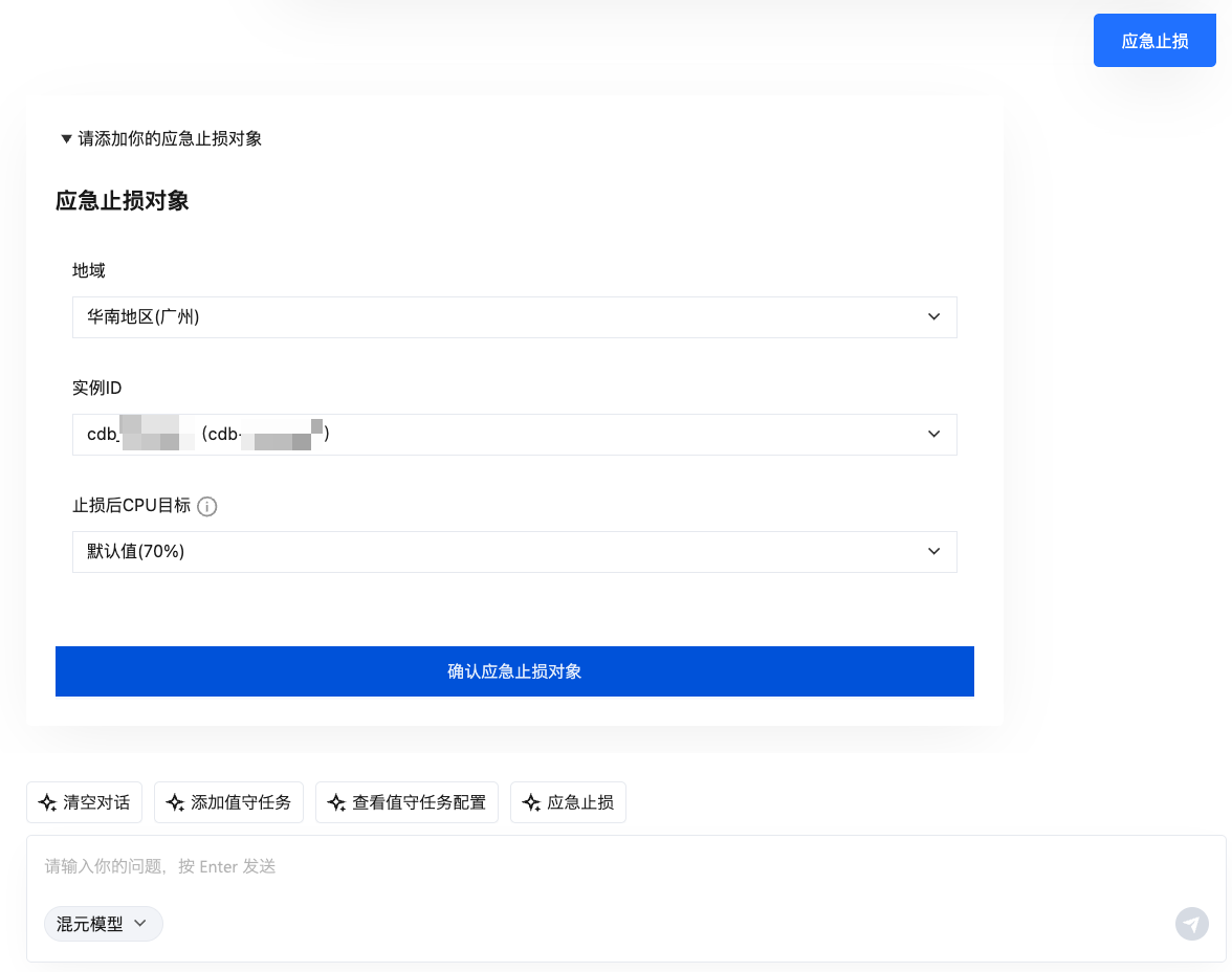 4. 在对话窗口,单击应急止损或在对话框输入创建实例 cdb-xxxxxxxx 应急止损任务。