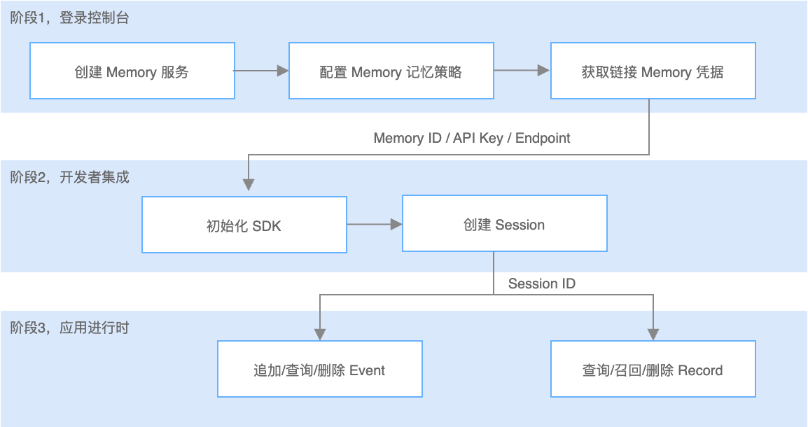 1 | 准备阶段 | 1. 创建 Memory 实例,并设置记忆策略。具体操作,请参见 新建 Memory。 2. 获取 Memory 连接凭据。具体操作,请参见 查看 Memory。 Endpoint :Memory 服务访问地址。 API Key :访问认证密钥。 Memory ID :系统随机分配的具有唯一标识的服务 ID。 |