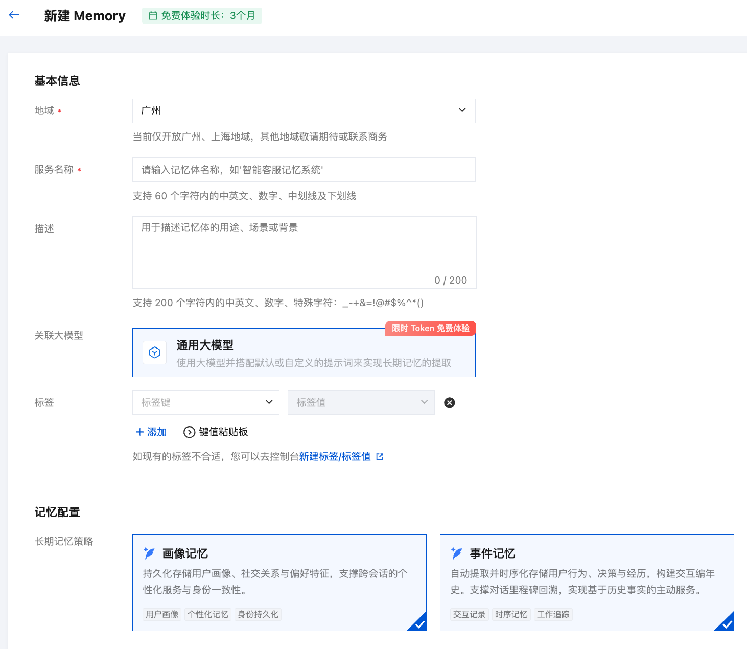 | 描述 | 对记忆体的使用场景、用途或者背景进行描述,便于识别与理解。 | 支持200个字符内的中英文、数字、特殊字符:_-+&=!@#$%^*() |