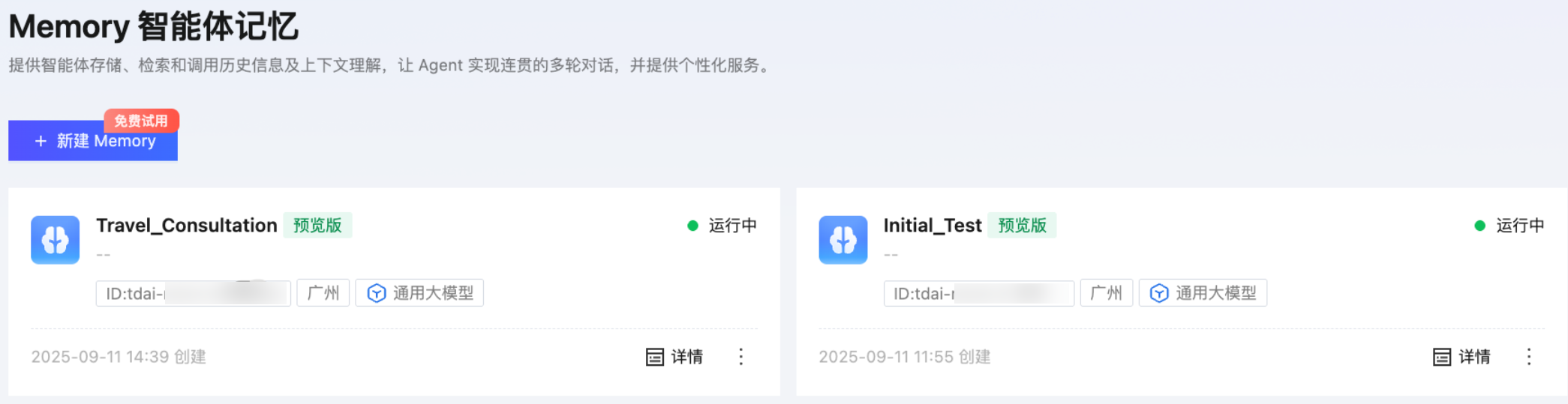 2. 在每一个 Memory 卡片上,您可以查看到 Memory 名称、ID、关联的大模型、 运行状态及创建时间。