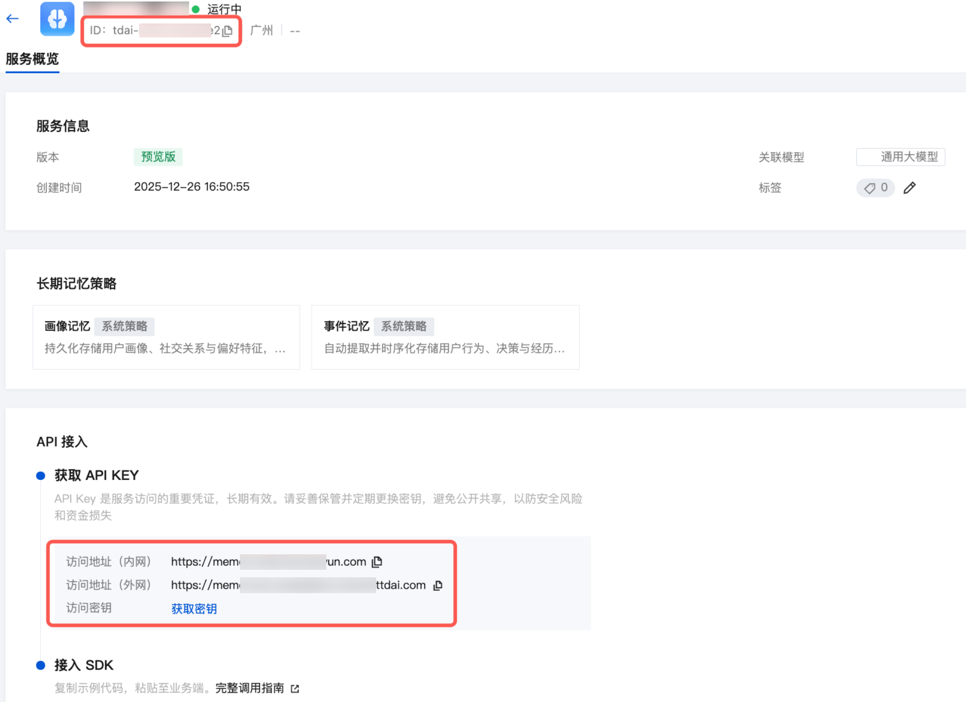 在 API 接入区域,可获取 Memory 的访问地址;单击获取密钥,可获取到 Memory 的访问密钥;单击接入 SDK 的完整调用指南可跳转至 SDK 接口文档,可使用 SDK 接口管理 Memory 的 Session、Event、Record 等资源。