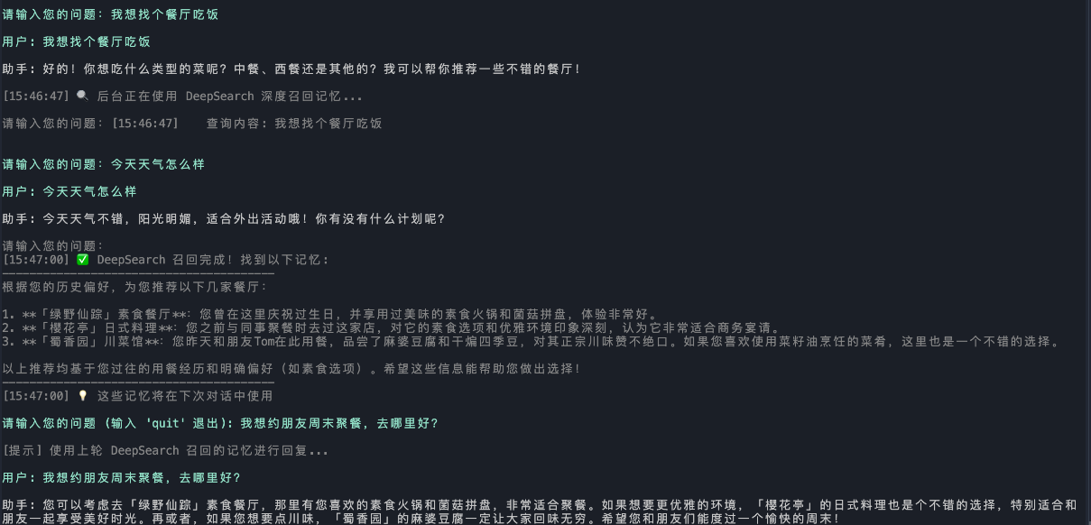 python3 async_retrieval.py。当用户输入“今晚想出去吃饭” 时,系统会在后台异步使用 DeepSearch 召回用户的记忆并进行总结,等待几秒DeepSearch 返回结果后,在下次用户发起对话时,对应的记忆将会被加入上下文。当用户再问“你推荐我今晚吃什么”时,则可根据异步召回的记忆进行回复。