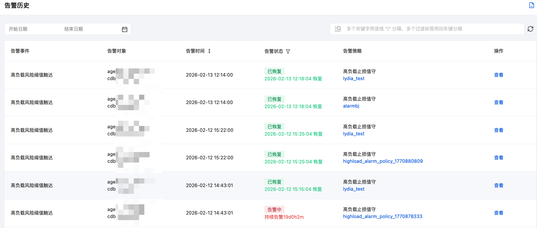 告警状态 | 告警当前状态。 告警中:告警条件仍然满足,问题尚未解决。 已恢复:告警条件已不满足,显示恢复时间。 无状态:一次性告警事件,无持续状态跟踪。 |