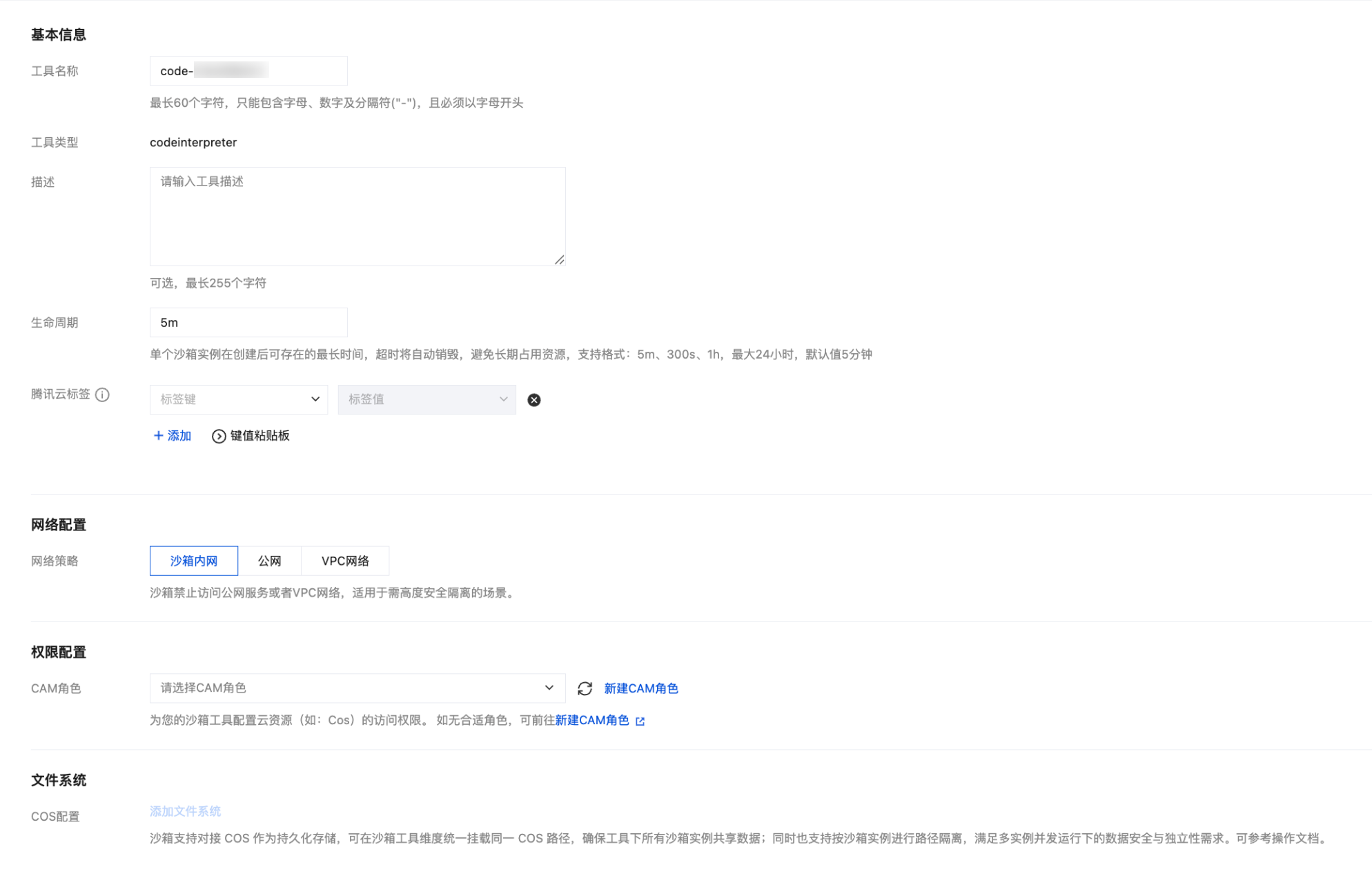 权限配置 | 非必填 | 为您的沙箱工具配置云资源(例如 COS)的访问权限。 |