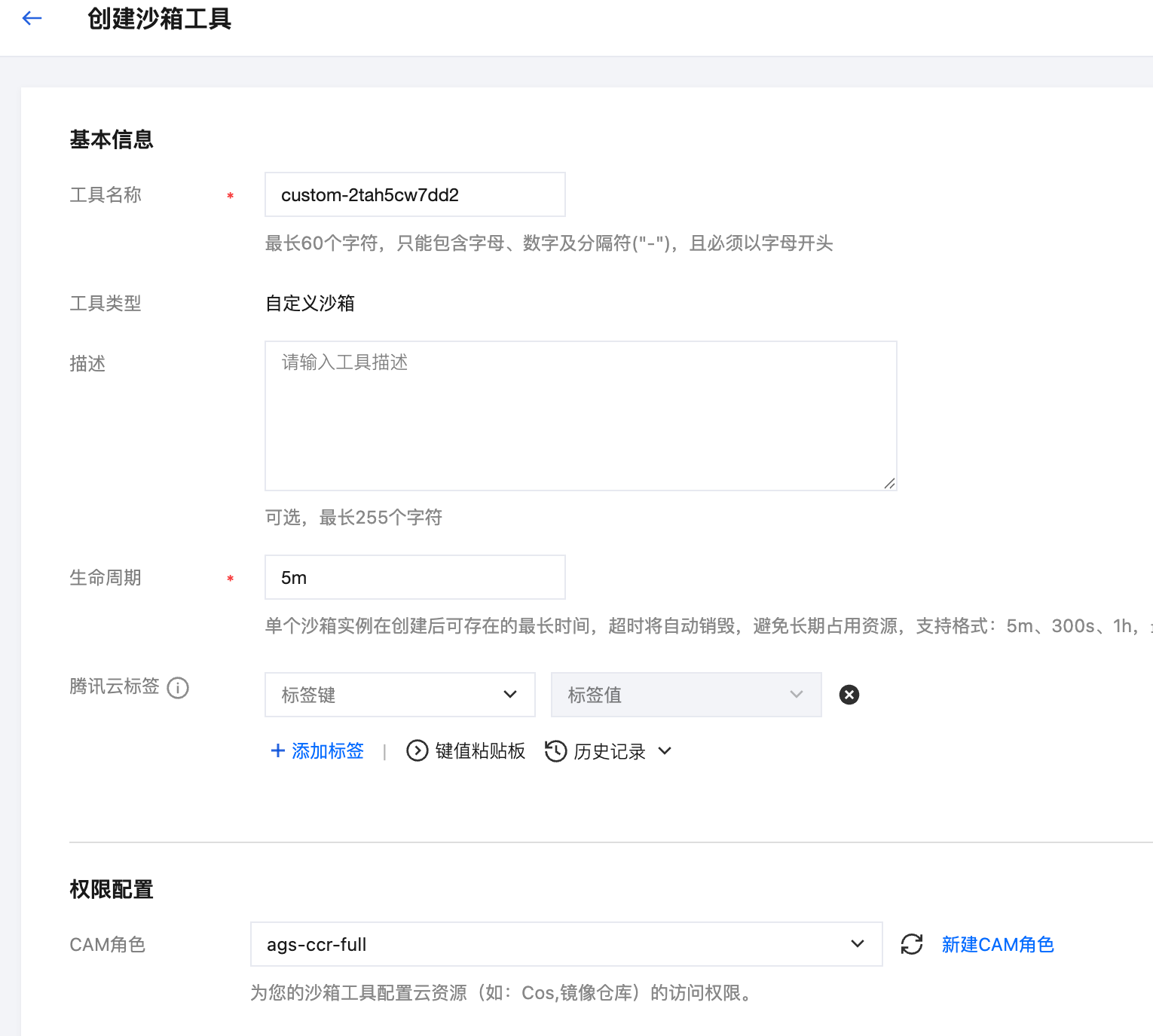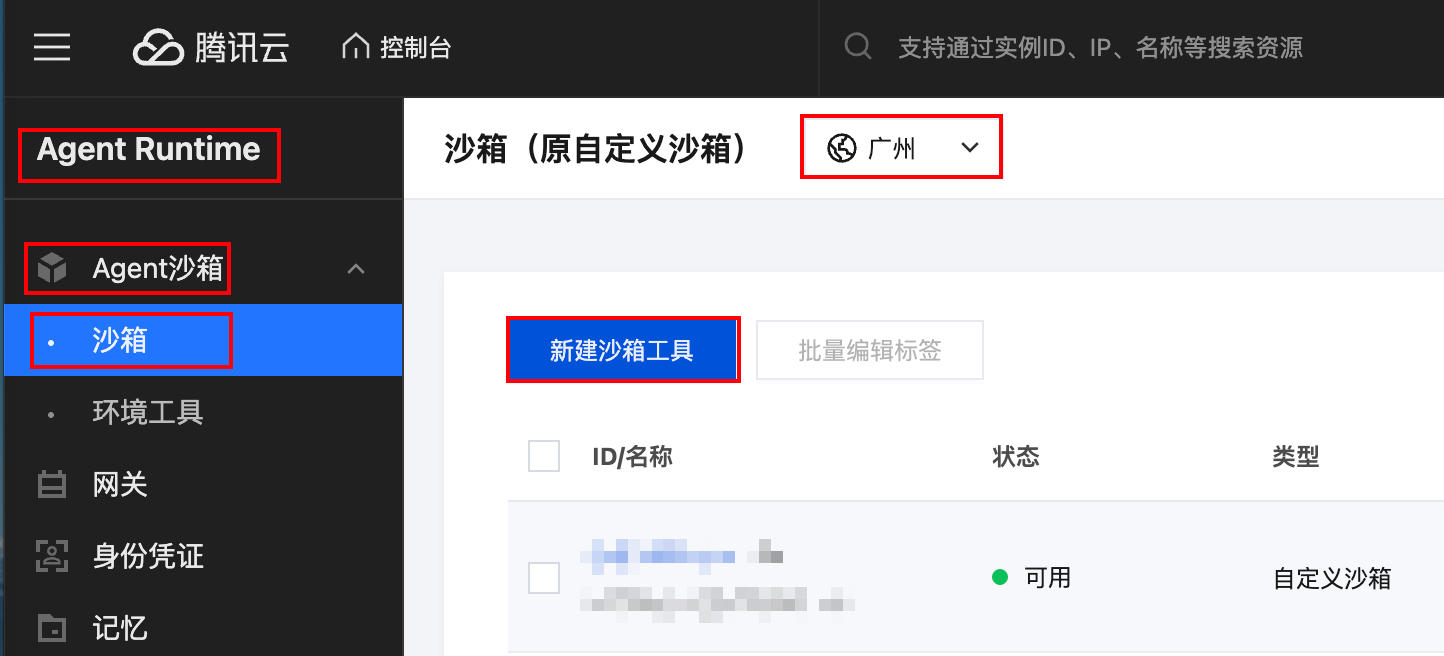 1. 访问腾讯云 Agent Runtime 的 沙箱(原自定义沙箱),单击新建沙箱工具。如下图所示: