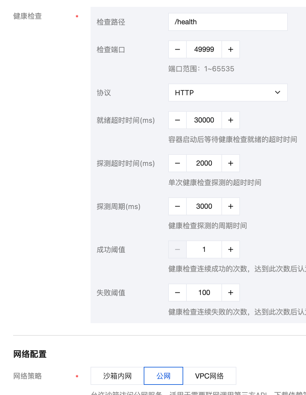/health 端口做探针,可以保证沙箱启动后功能可用。2.5 按需配置其他参数如文件系统挂载、环境变量等。