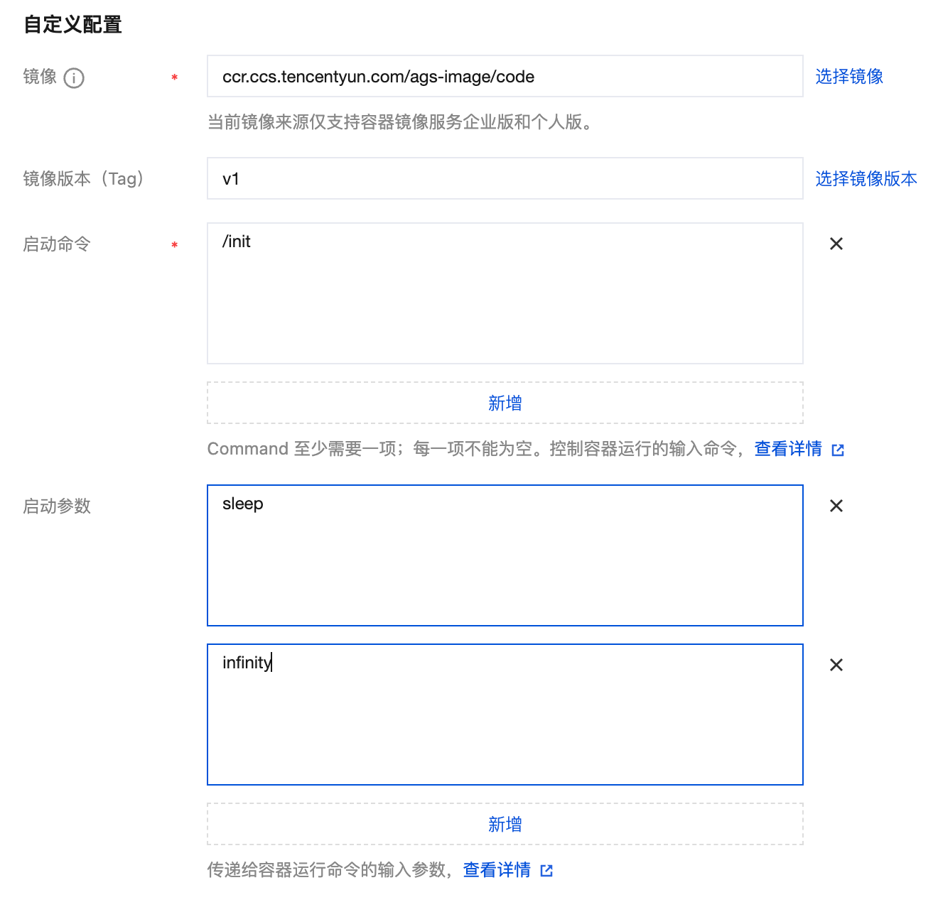 sleep infinity 替换为您的应用启动命令,例如:python /app/app.py。具体参数填写方式请参考下方注意事项:1. 启动命令必须为