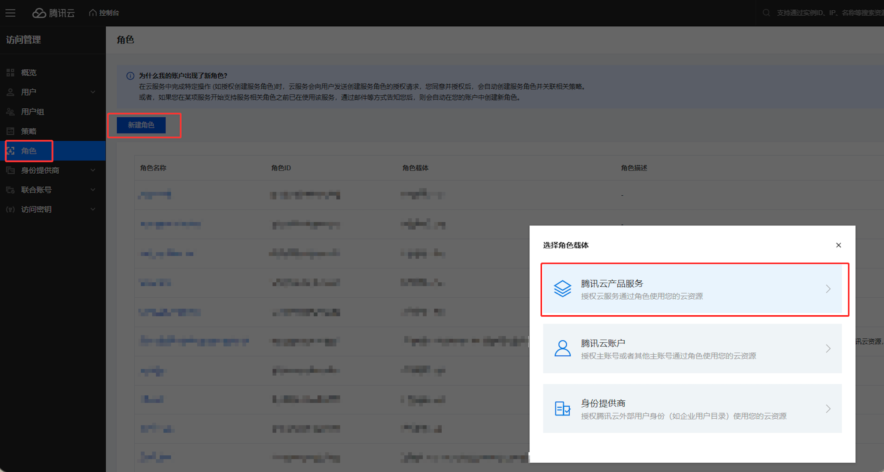 2. 单击新建角色,选择角色载体:腾讯云产品服务。如下图所示: