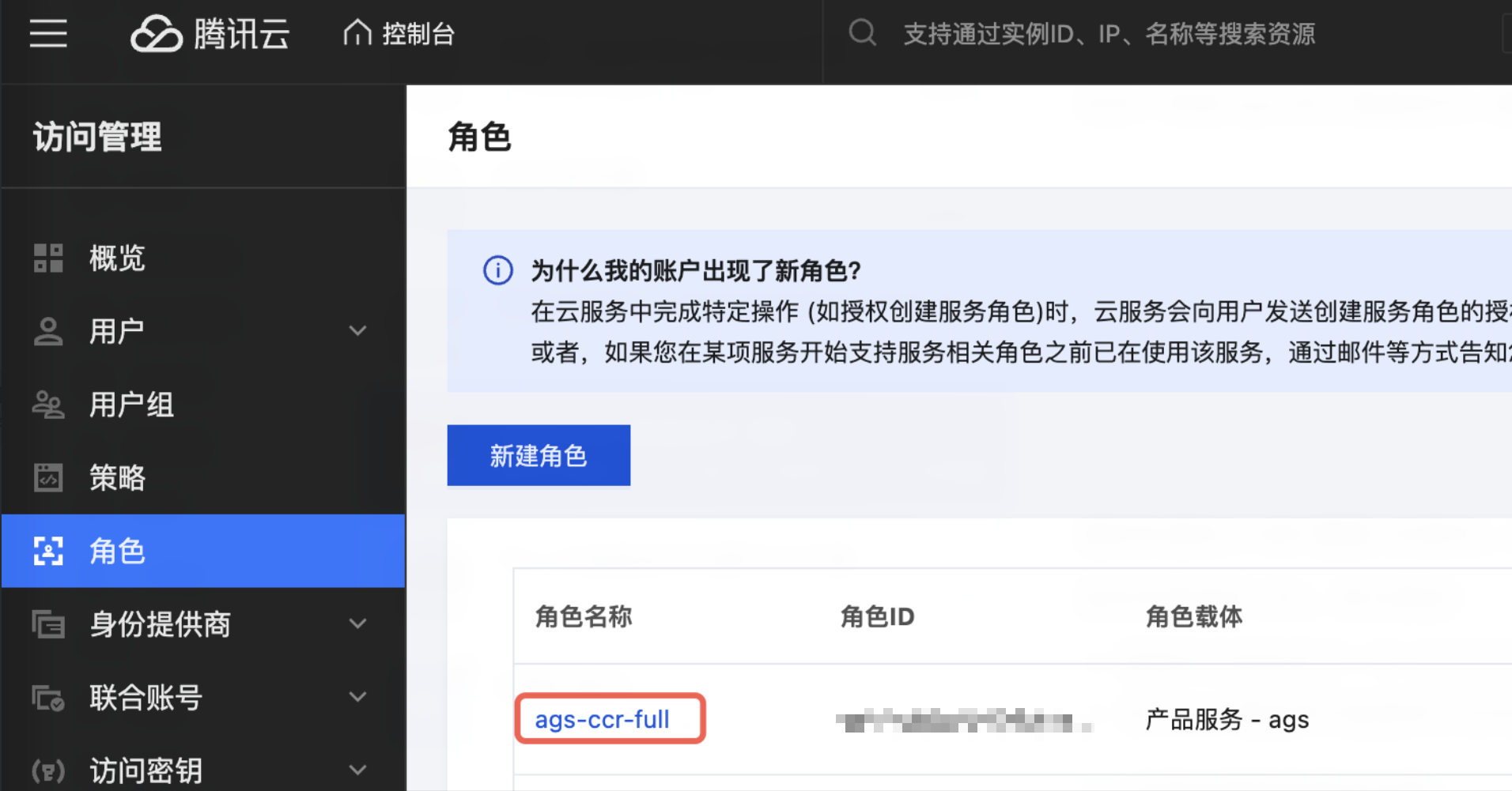 1. 登录腾讯云 访问管理控制台,选择左侧导航中的角色。