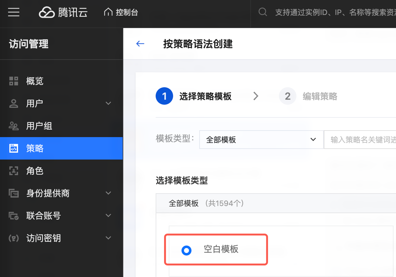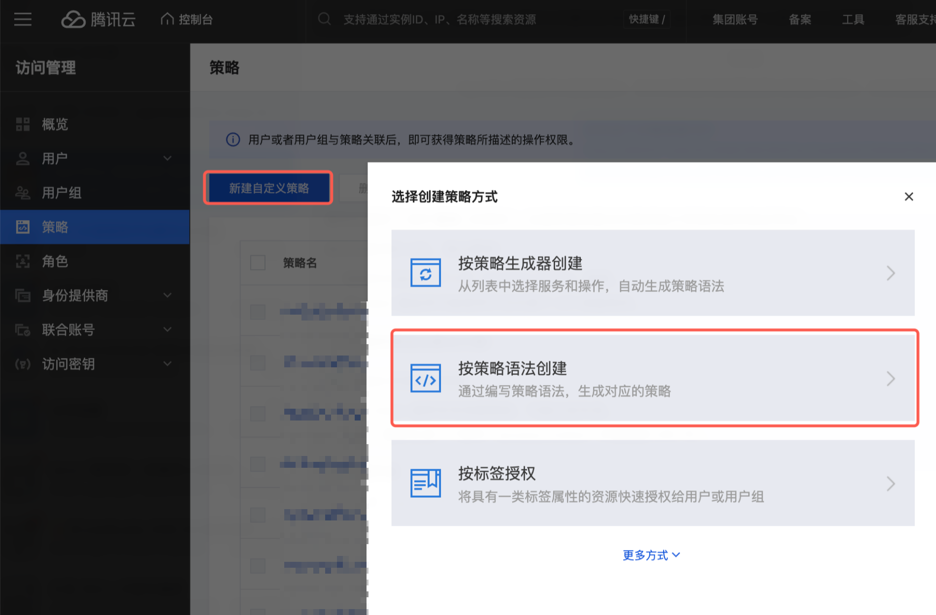 4. 访问腾讯云 访问管理控制台的策略页面,单击新建自定义策略。