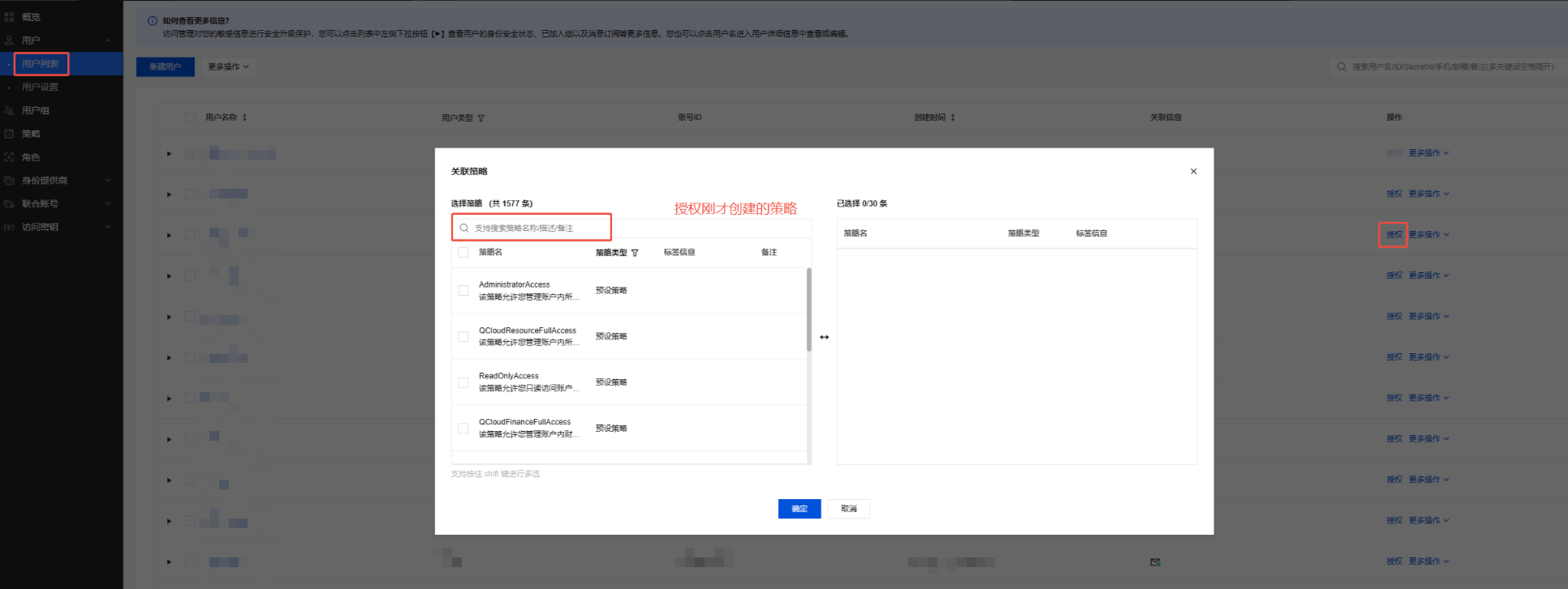5. 进入访问管理控制台的 用户列表,为目标用户或用户组授予策略。