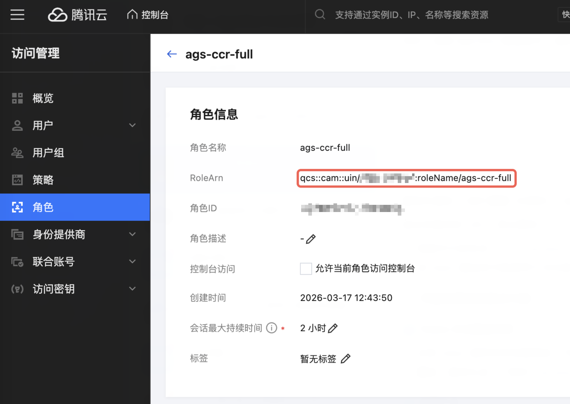 {"version": "2.0","statement": [{"action":["cam:PassRole"],"effect":"allow","resource":["qcs::cam::uin/**********:roleName/ags-ccr-full"]}]}