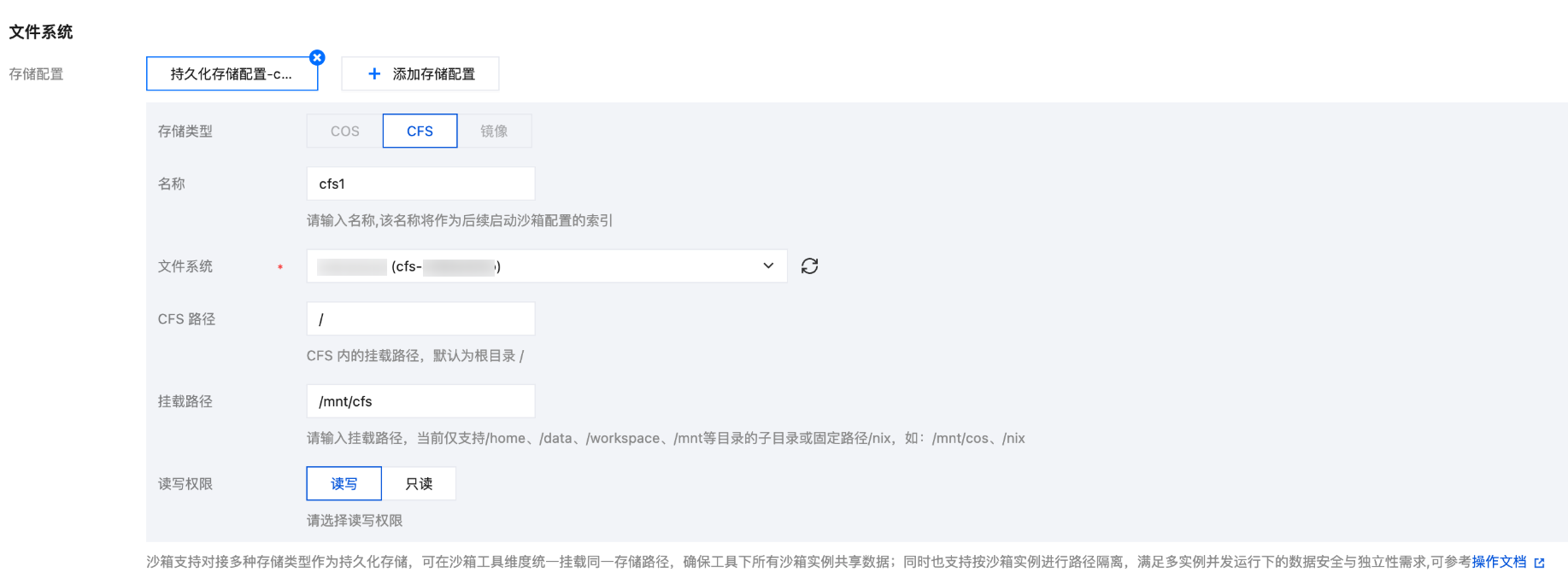 名称 | 是 | 该字段用于定义 CFS 路径与沙箱本地路径的挂载映射关系。 在跨实例文件隔离场景下,该字段将作为沙箱实例创建时的关键配置项,用于指定实例级别的存储挂载。 |