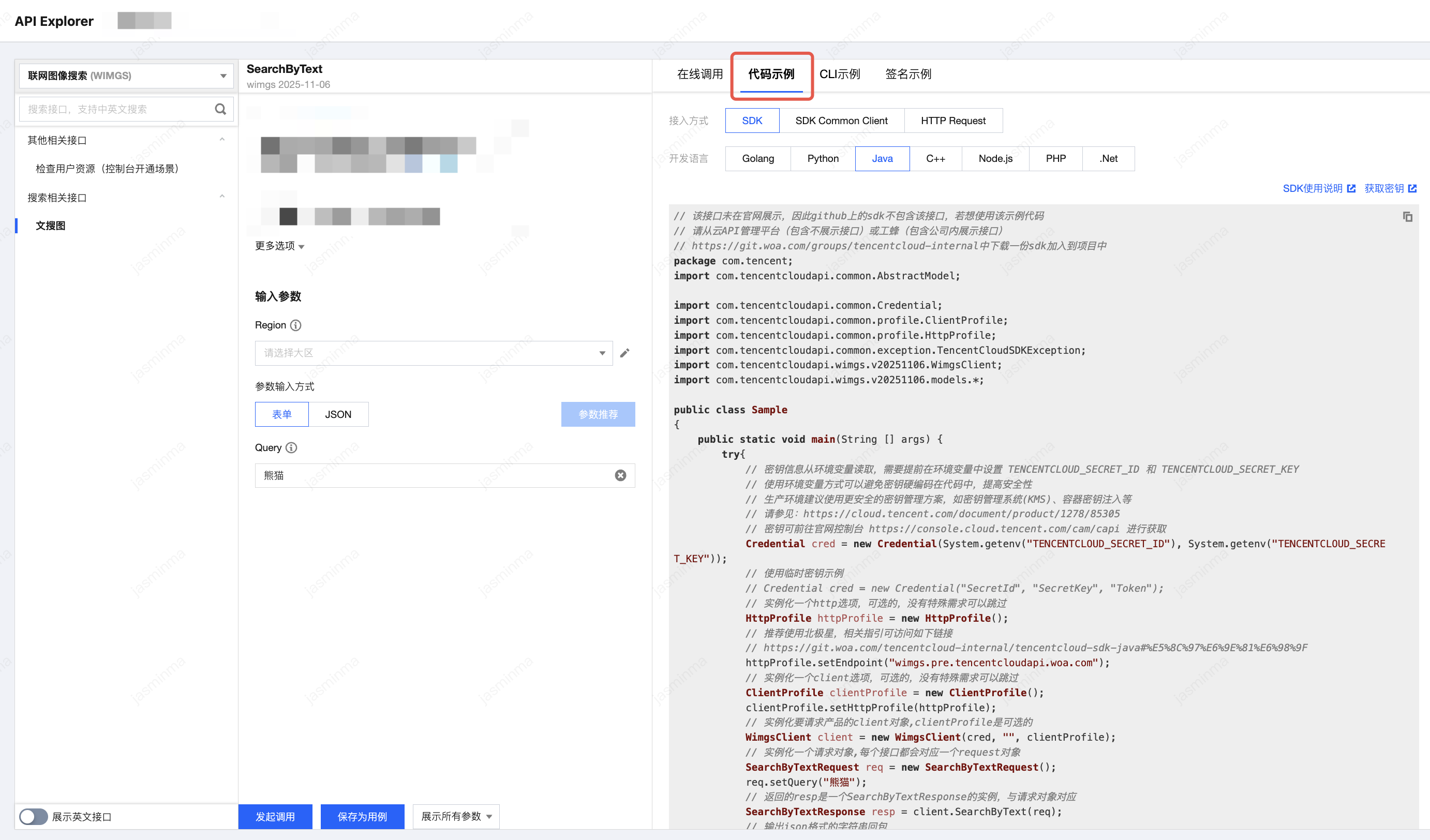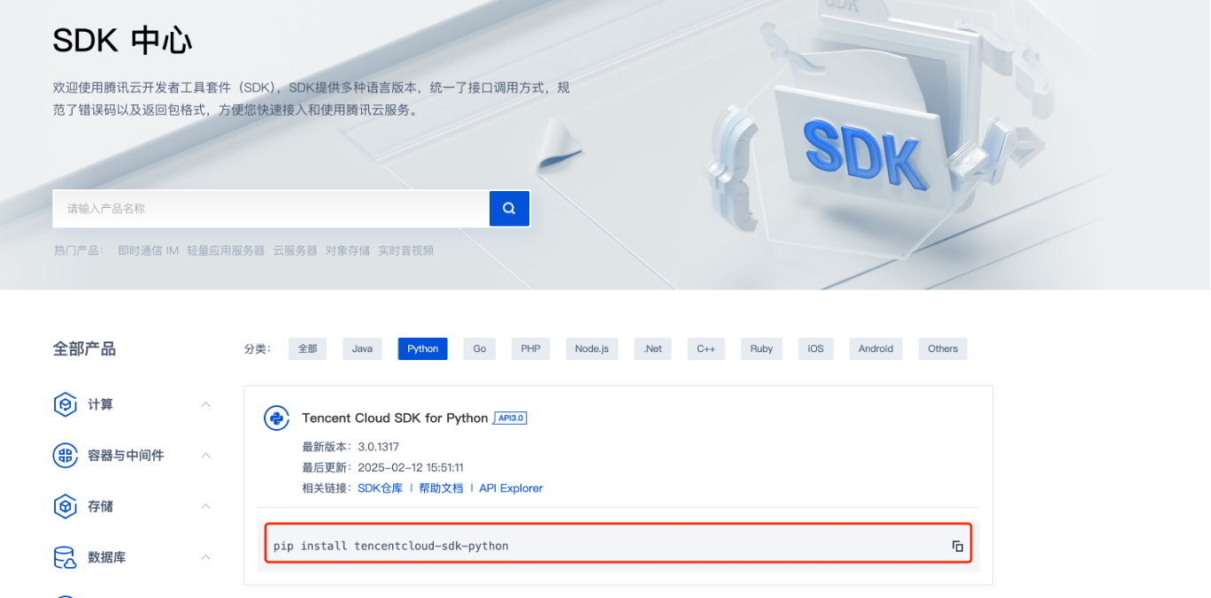 说明:腾讯云已编写好的开发工具集(SDK),支持通过调用联网图像搜索 API 开发功能。目前 SDK 已支持多种语言,包括 Python、Java、PHP、Go、Node.js、.Net 等,可在每个服务的文档中下载对应的 SDK。