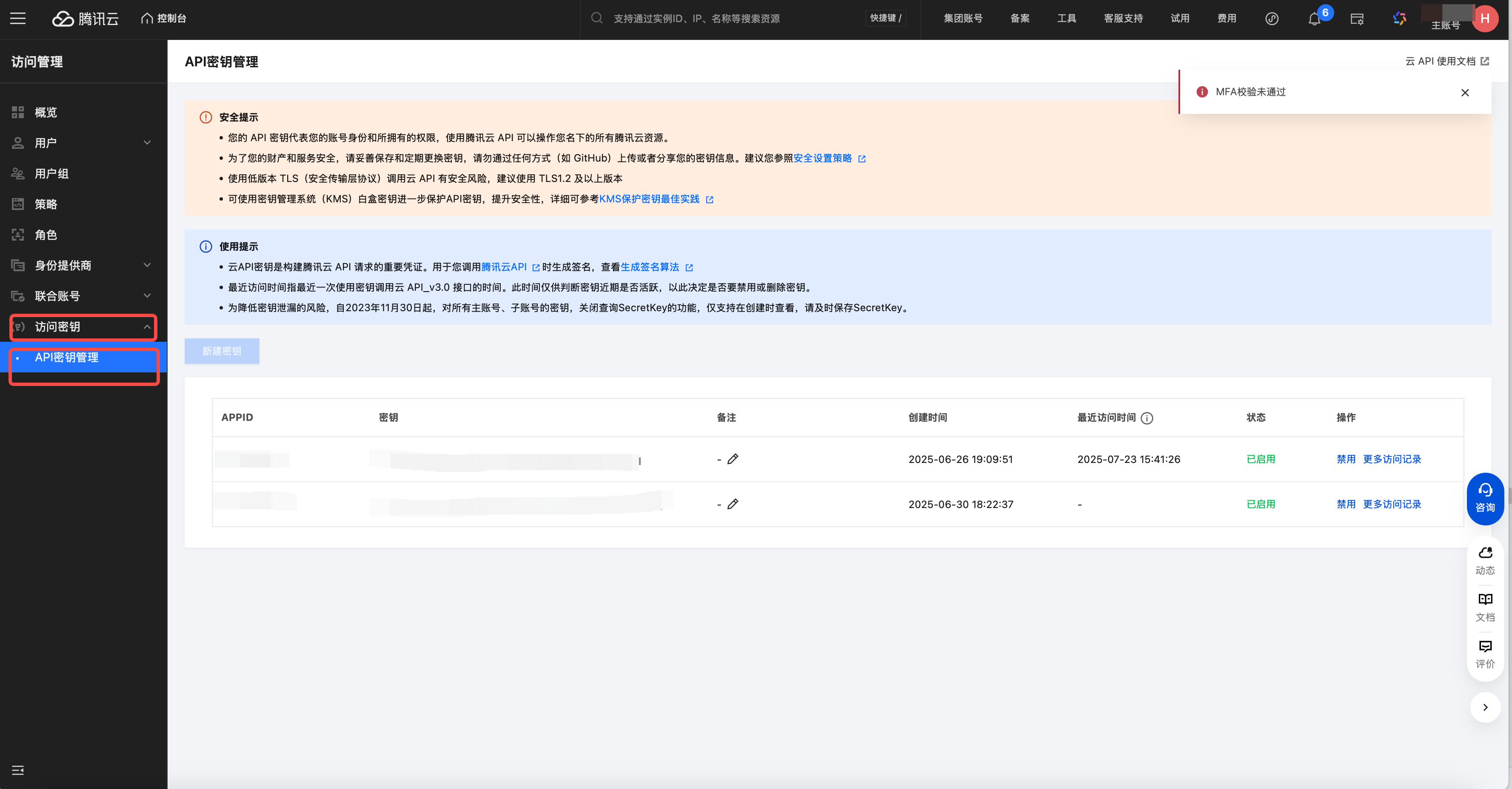 1. 前往腾讯云官网控制台 API 密钥管理 界面获取密钥。