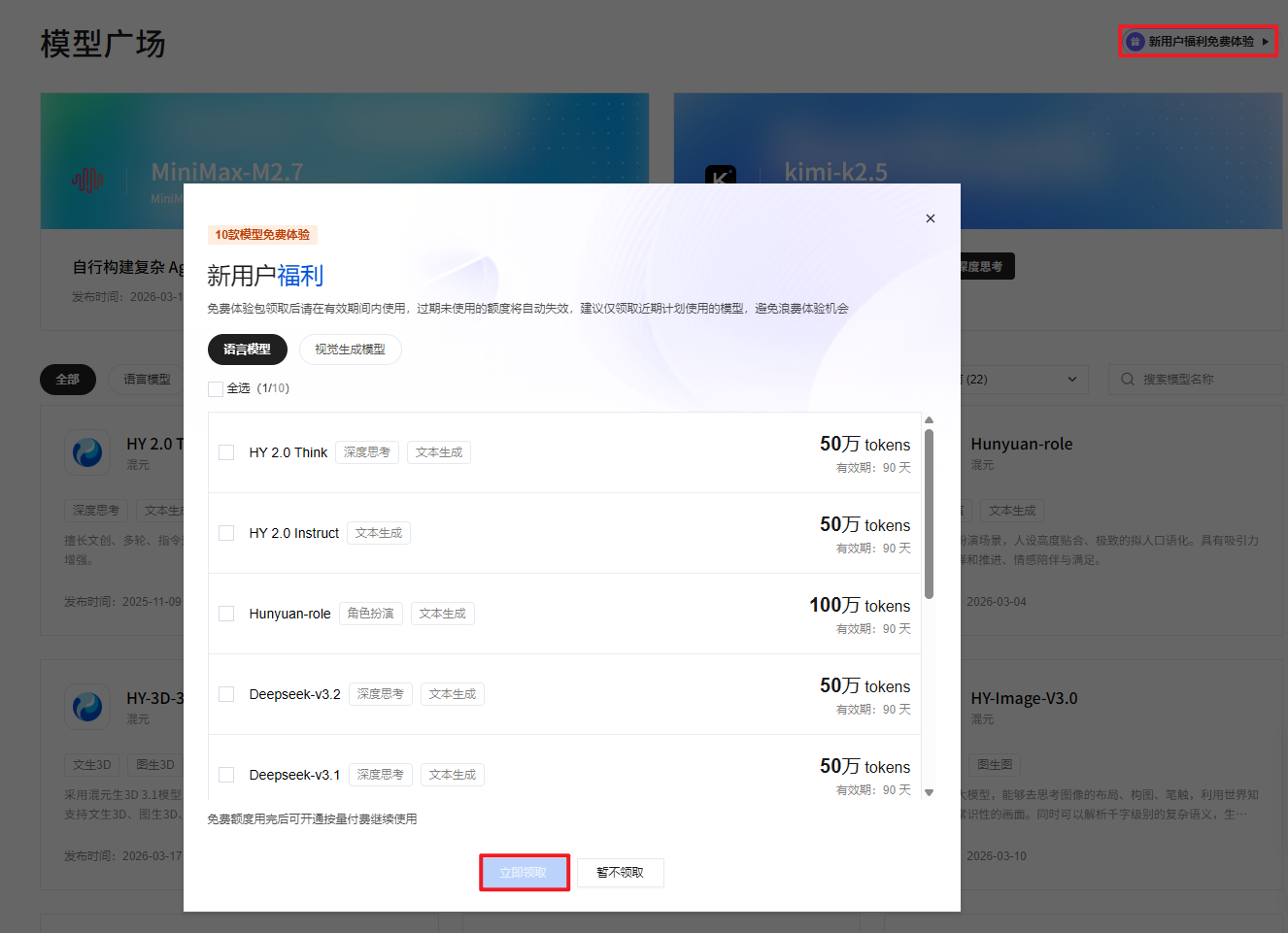 2. 在弹窗中勾选模型后,单击立即领取,即可获得多个模型的免费使用额度。