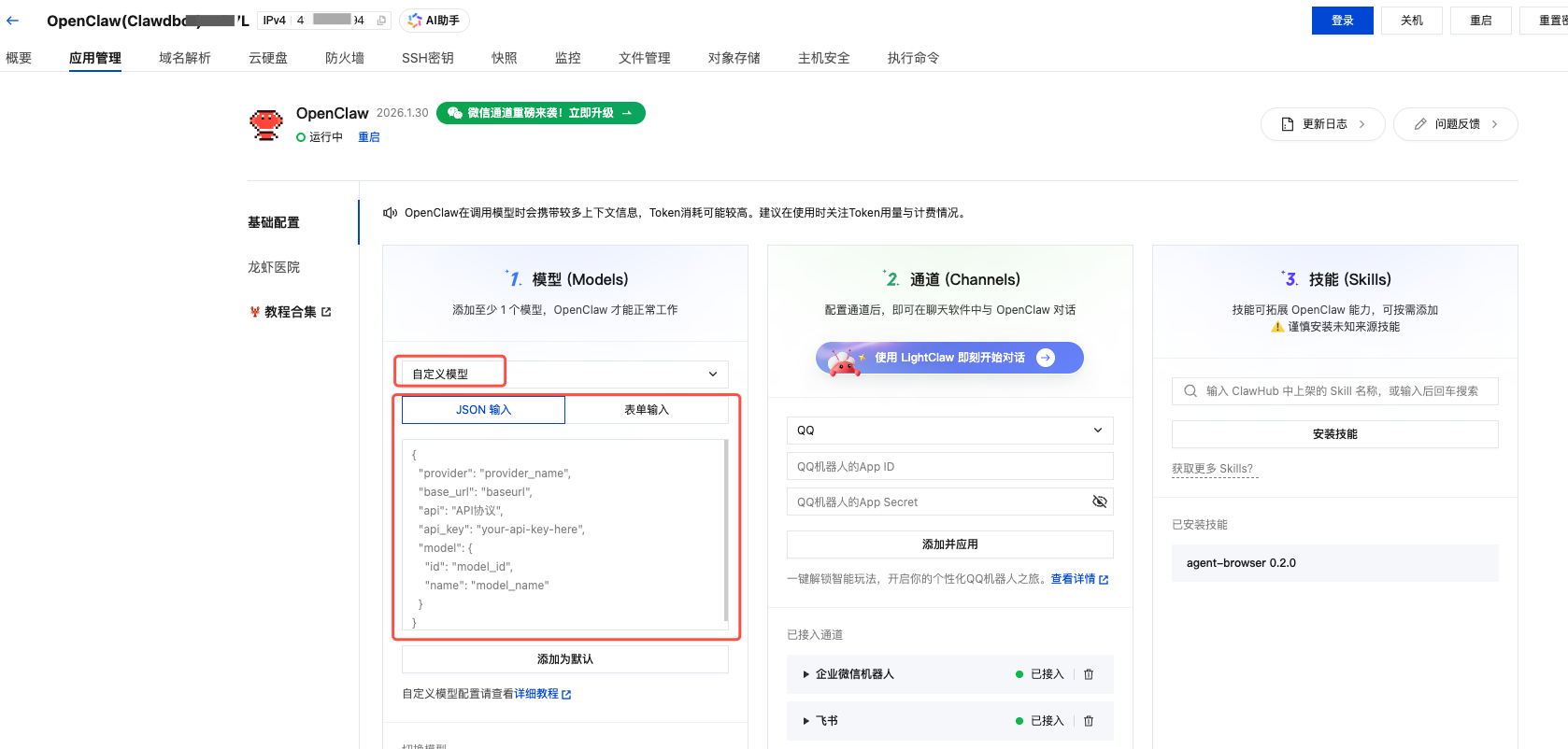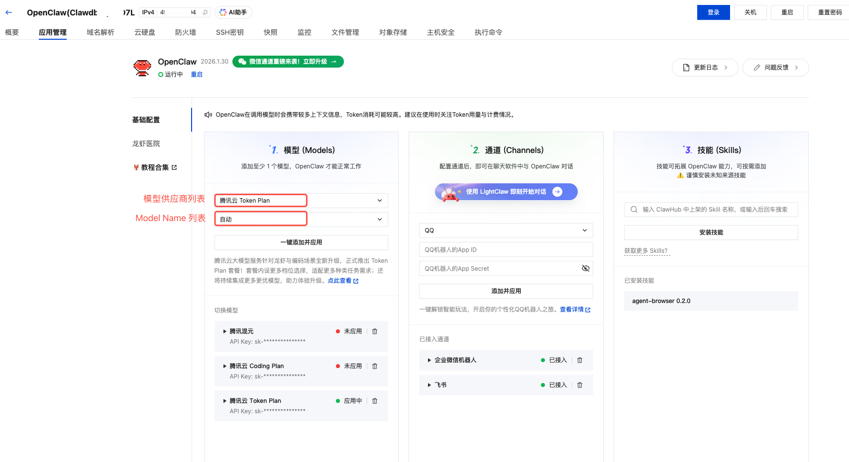 如果您的 Token Plan 套餐和腾讯云轻量应用服务器不在同一个账号:可以通过自定义模型配置 Token Plan 模型。在应用管理界面中找到模型(Models)配置区域: