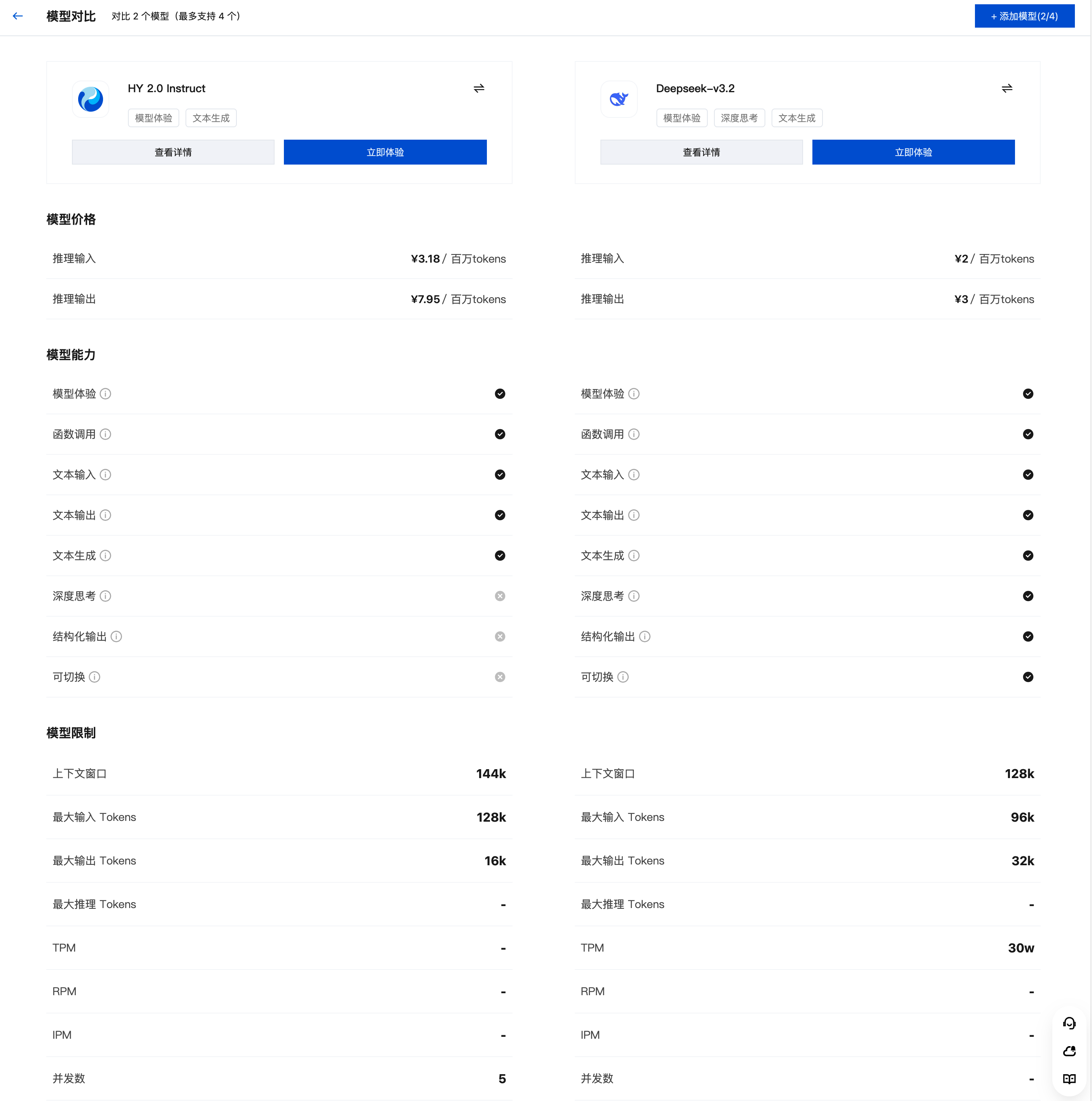 在模型详情页,您可以通过单击右上角的模型对比,选择多个模型来对比参数,帮助您快速了解各模型差异: