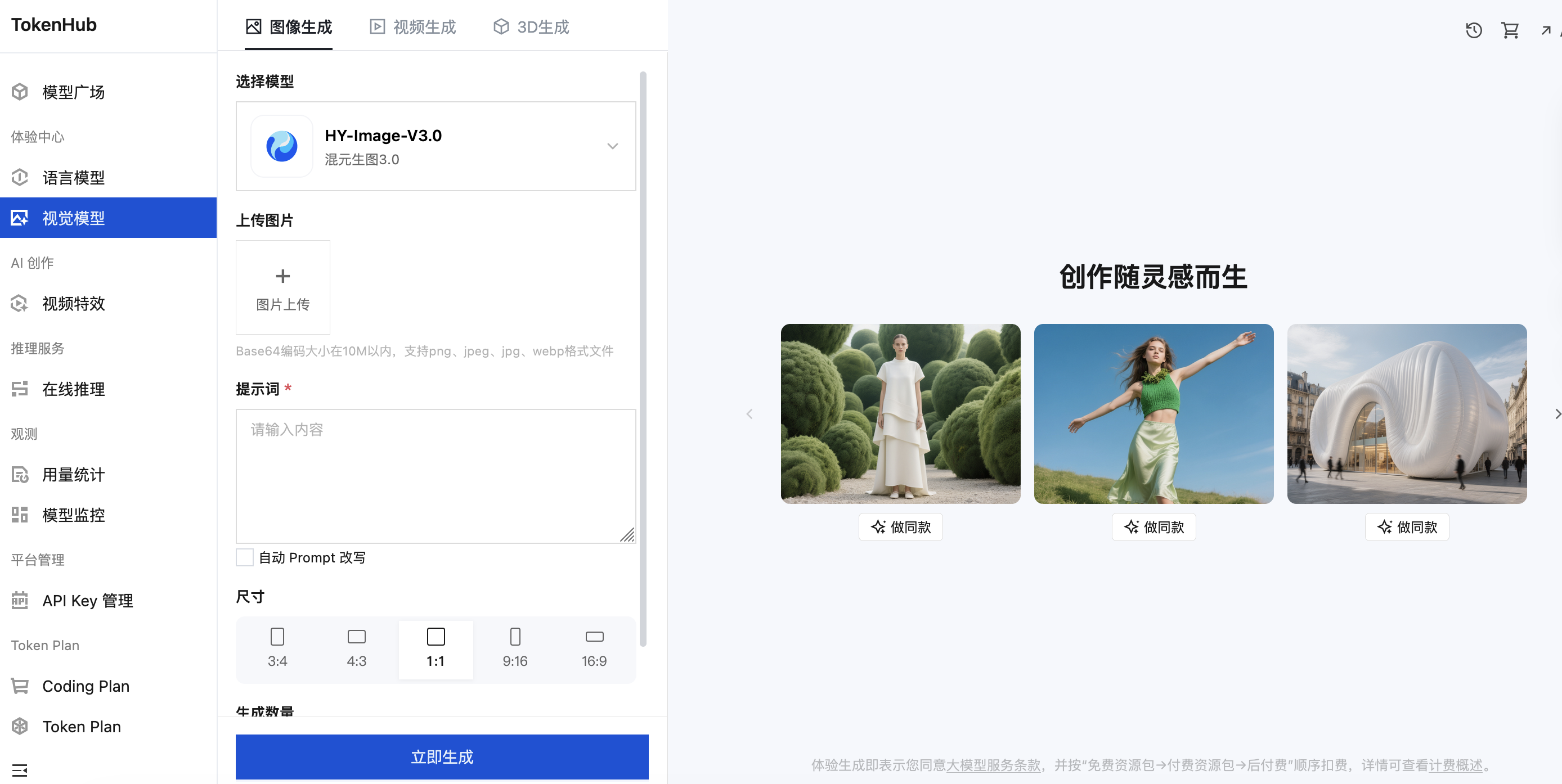 1. 进入功能:进入 视觉模型 页面,选择图像生成页签。
