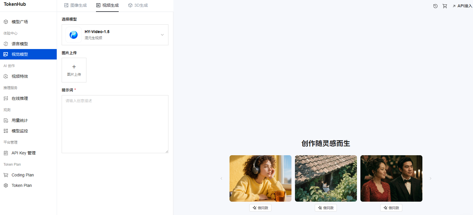 1. 进入功能:进入 视觉模型 页面,选择视频生成页签。