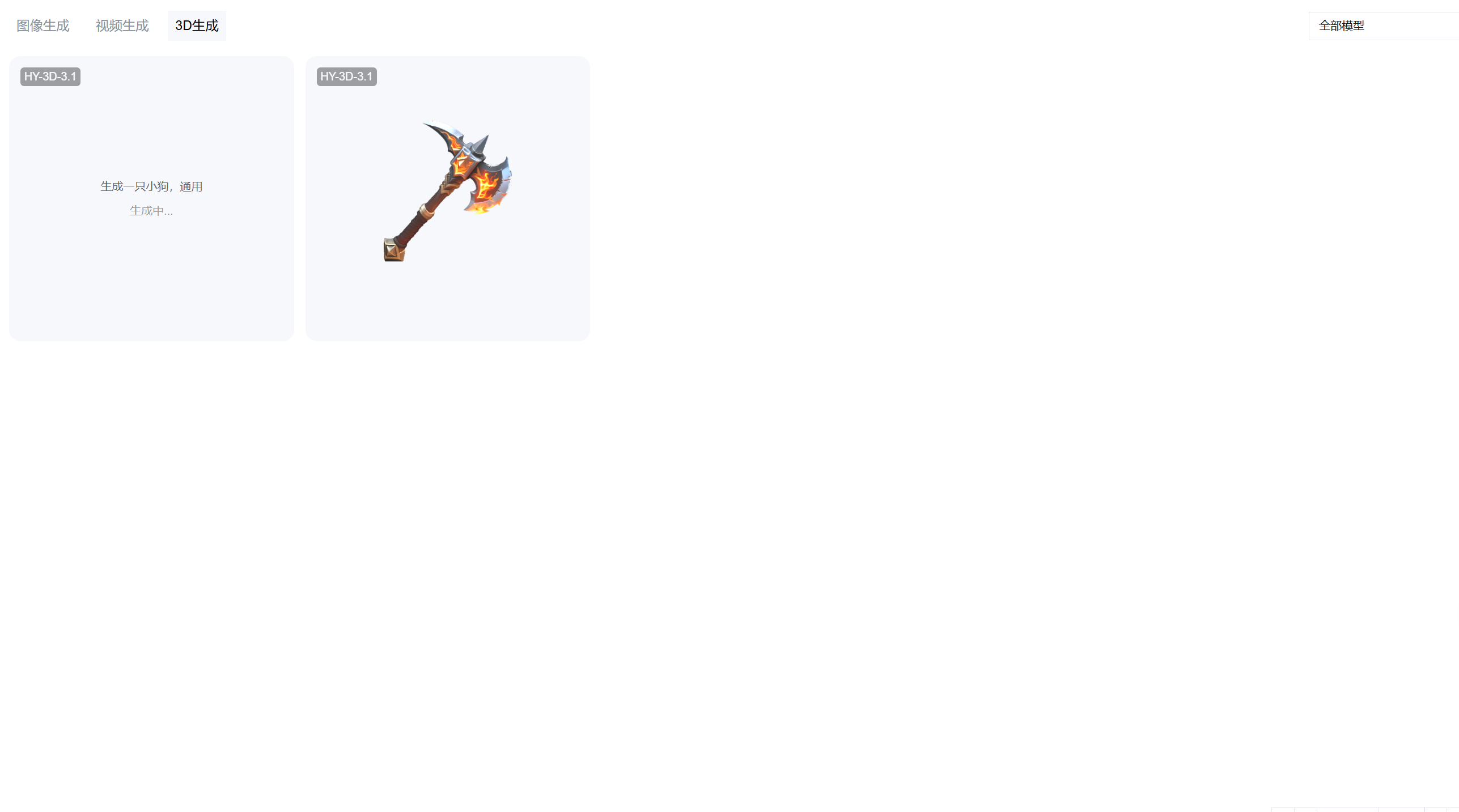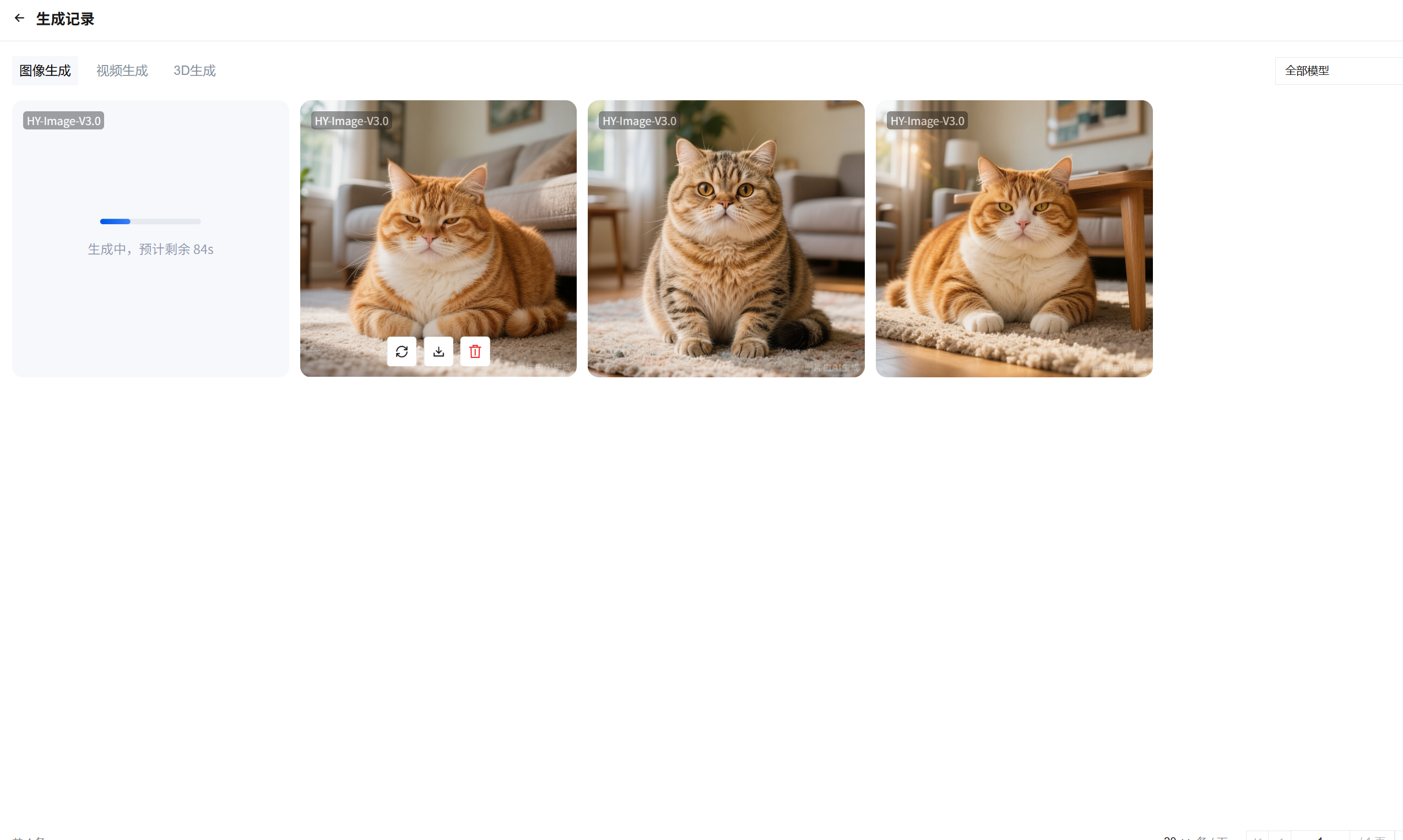 生成记录以任务卡片的形式呈现,展示生成作品缩略图、使用模型、任务状态(已完成 / 生成中 / 生成失败)。其中:对于在“生成中”的任务,若为文生3D,则会显示用户的提示词 + 生成进度;若为图生3D,会显示参考图 + 生成进度。