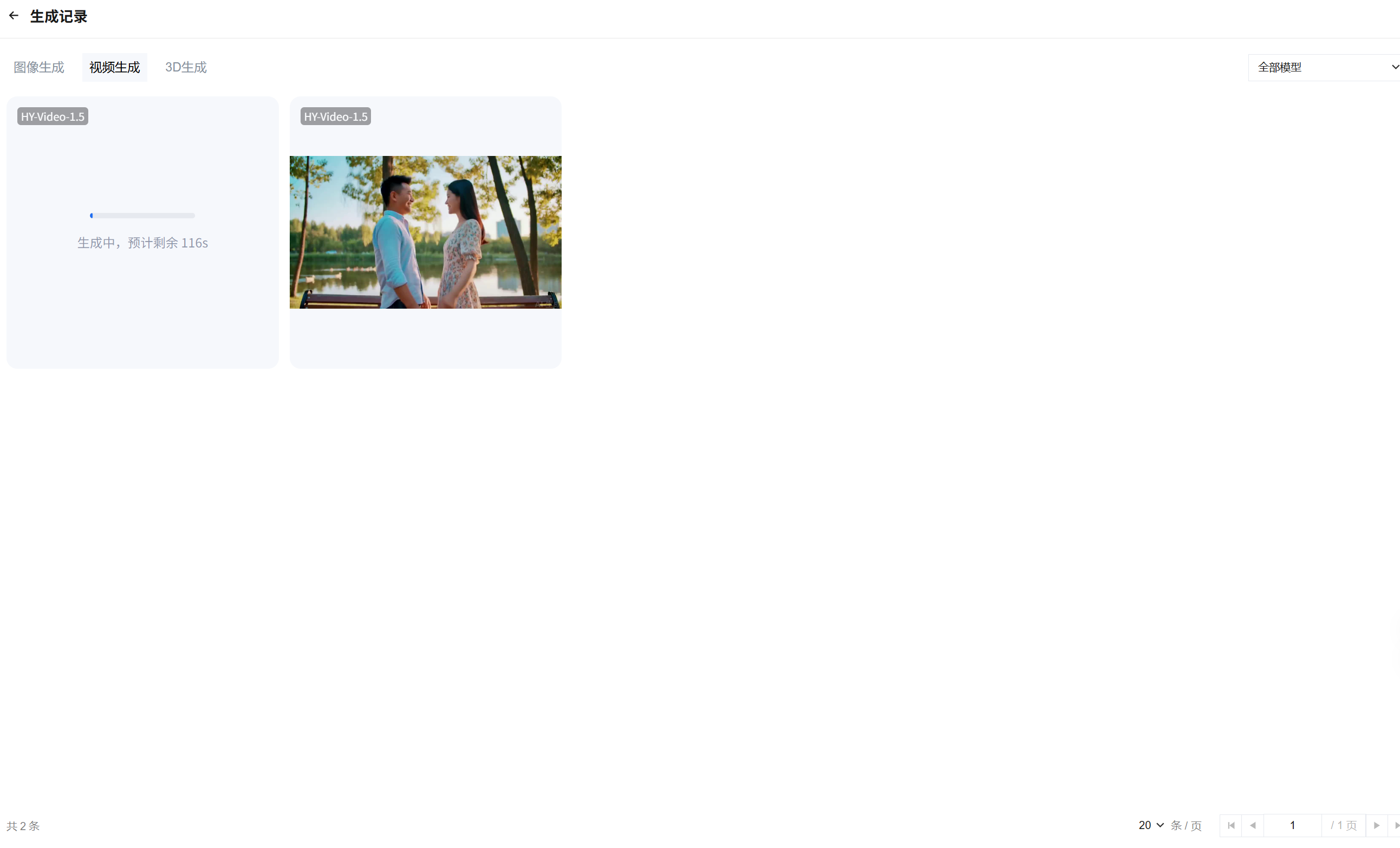 生成记录以任务卡片的形式呈现,展示生成作品缩略图、使用模型、任务状态(已完成 / 生成中 / 生成失败)。