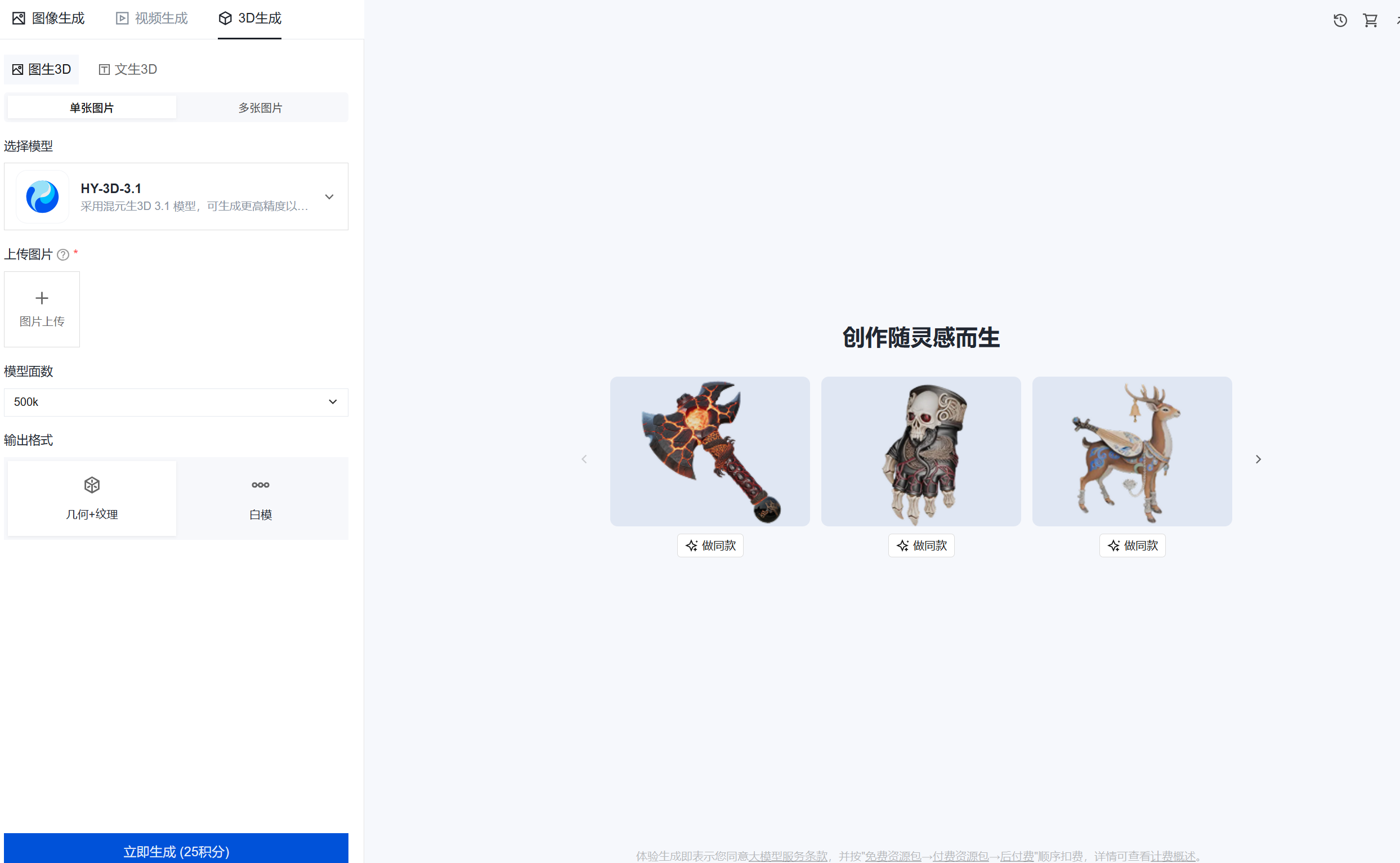 5. 参考同款(可选):在页面右侧单击示例图下方的做同款,一键复用对应 3D 模型的生成参数。