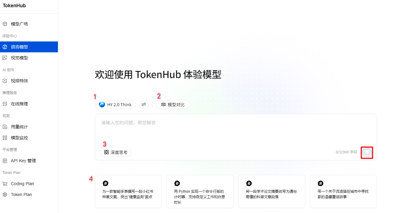 4 | 灵感推荐 | 提供多个灵感推荐内容,包含预设的示例问题。这些示例覆盖不同使用场景,帮助您快速了解模型的能力范围。 |