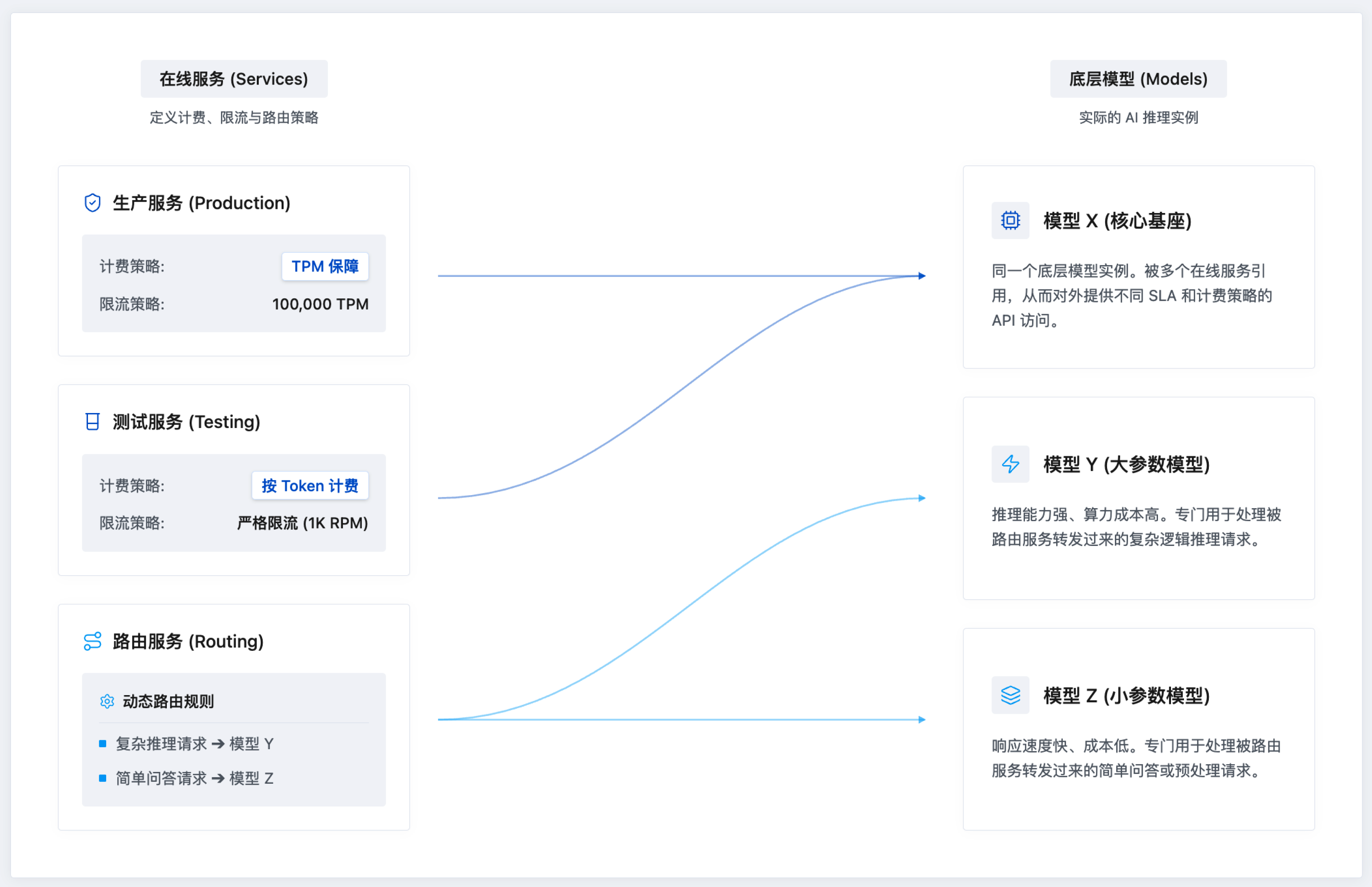 在线推理用于管理如何使用模型,例如免费额度用量、是否开启按 Token 计费,安全策略、限流策略等。与模型的关系参考下图: