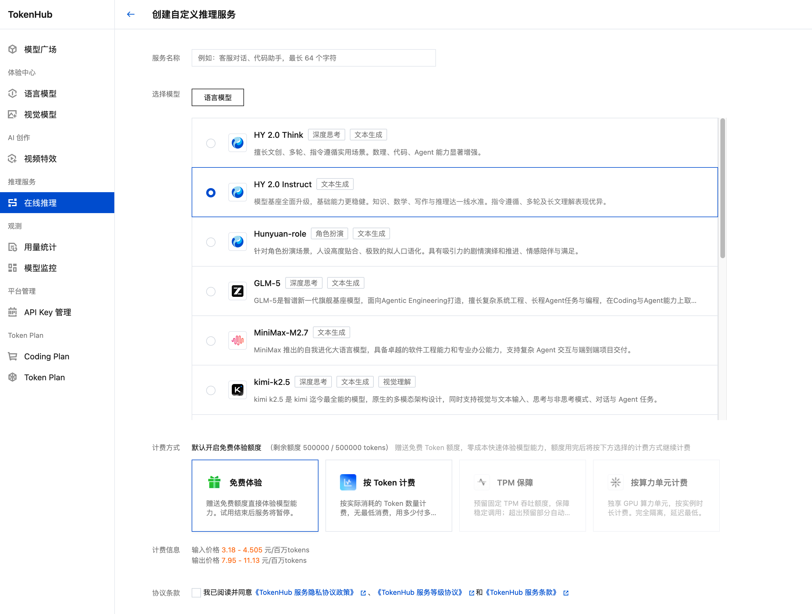 自定义推理服务支持选择更丰富的计费方式,例如 TPM 保障包。未来,平台还将进一步支持在自定义服务中配置智能路由、限流规则、插件启停等能力,帮助您实现更灵活的服务管理与治理。