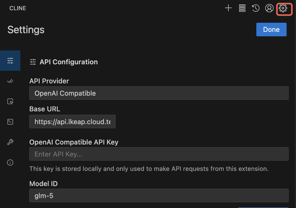 Cline 插件安装完成后,单击右上角的设置按钮,配置以下信息:
