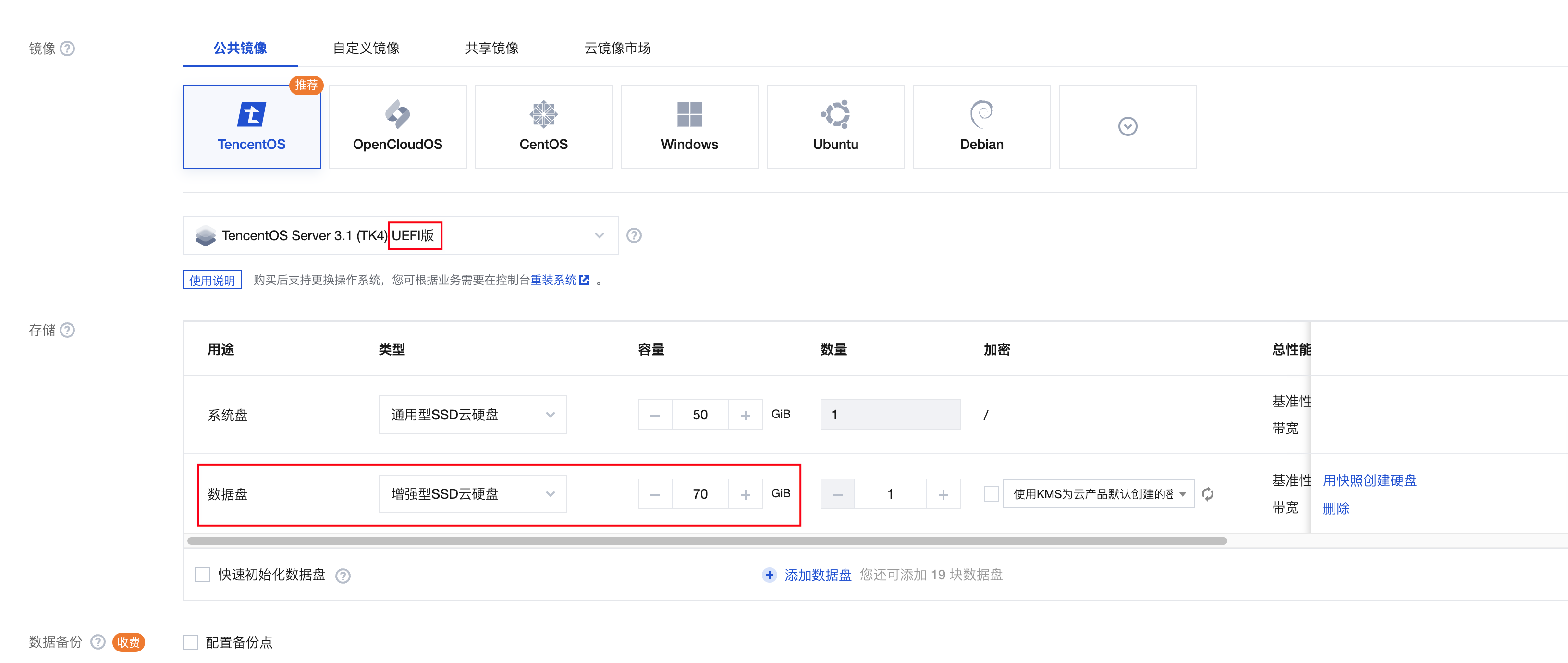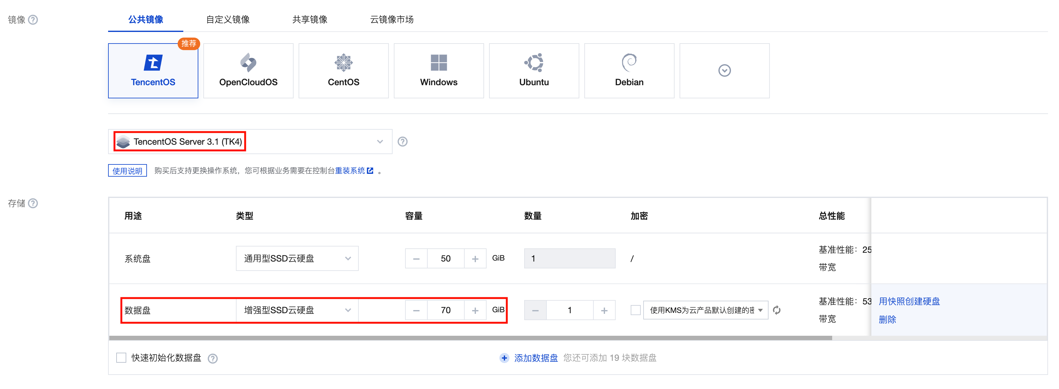 创建实例时至少挂载一块数据盘,数据盘大小要大于发行版 ISO 的大小。