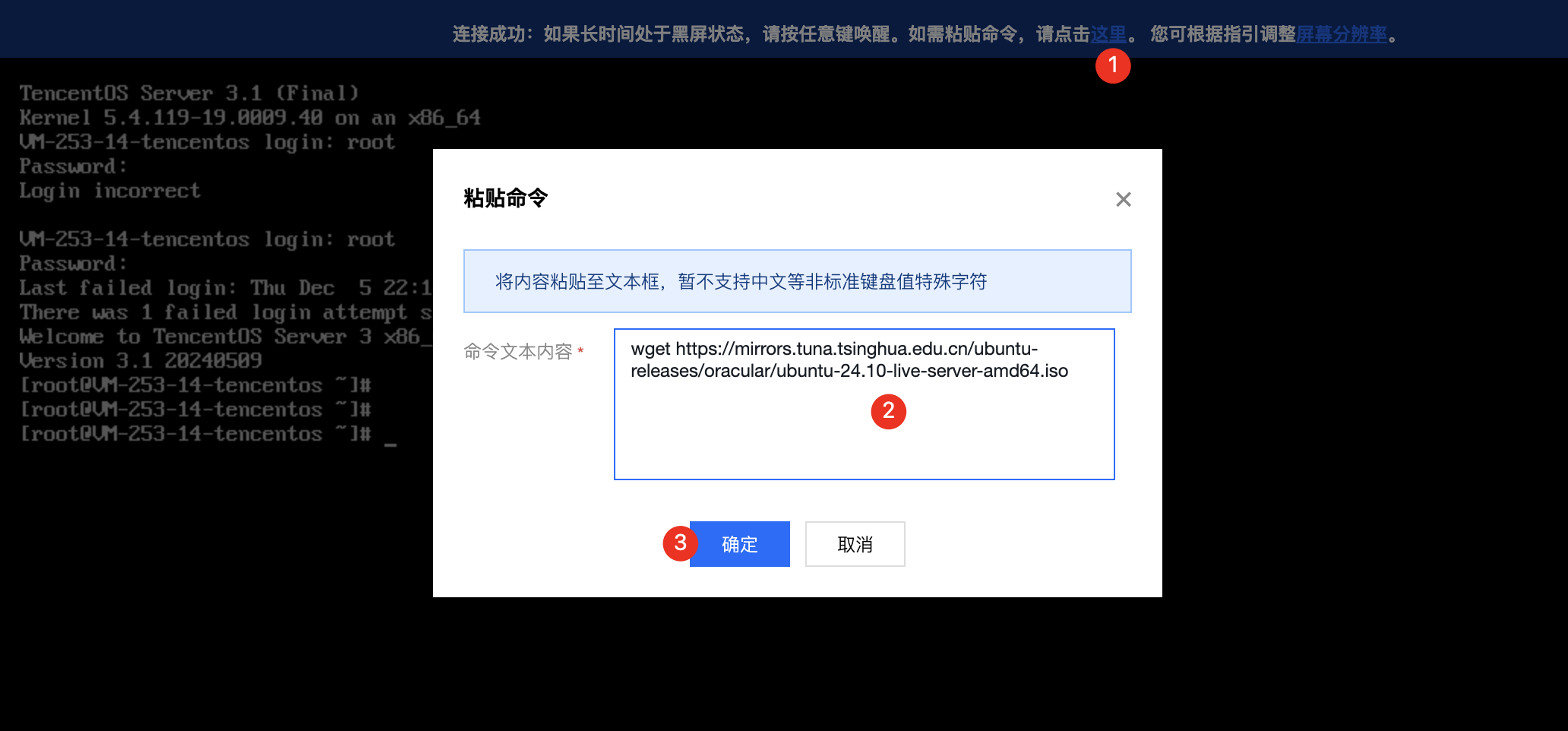 2. 实例创建完成后,通过 VNC 登录实例,粘贴网址下载对应的 ISO。