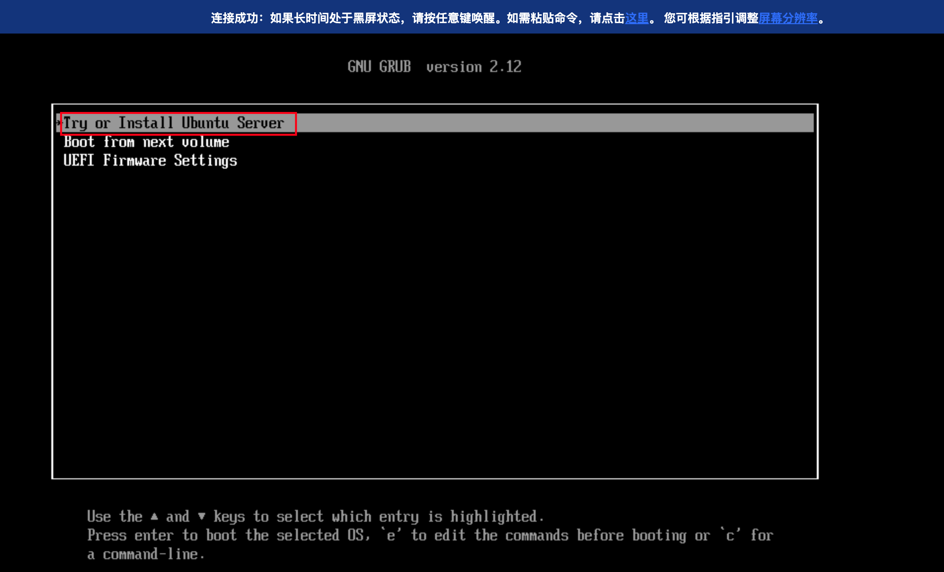 上述步骤操作成功时,会进入 ISO(这里是 Ubuntu 24.10)的 GRUB 页面,在该界面选择 Try or Install Ubuntu Server。