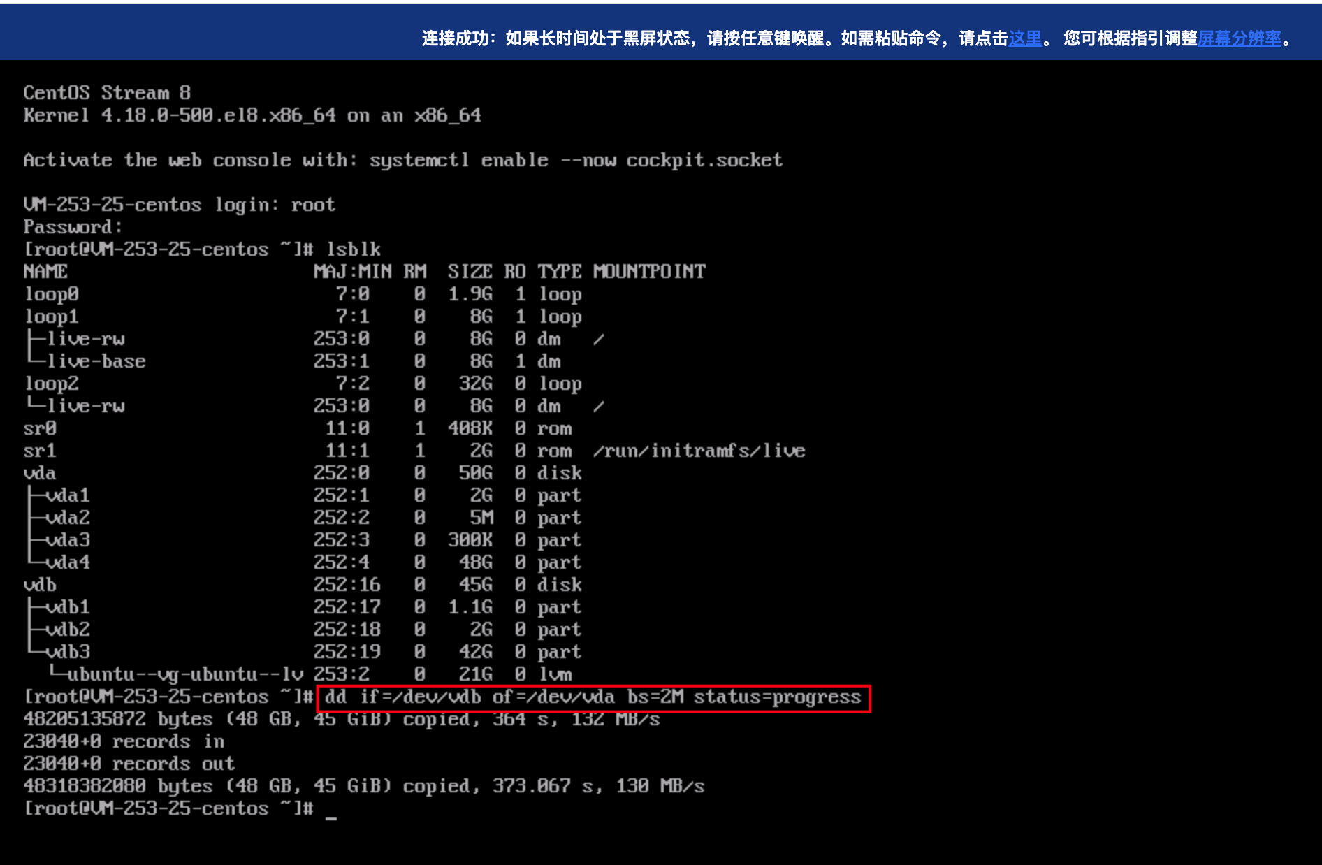 命令将数据盘内容写入到系统盘。dd if=/dev/vdb of=/dev/vda bs=2M status=progress