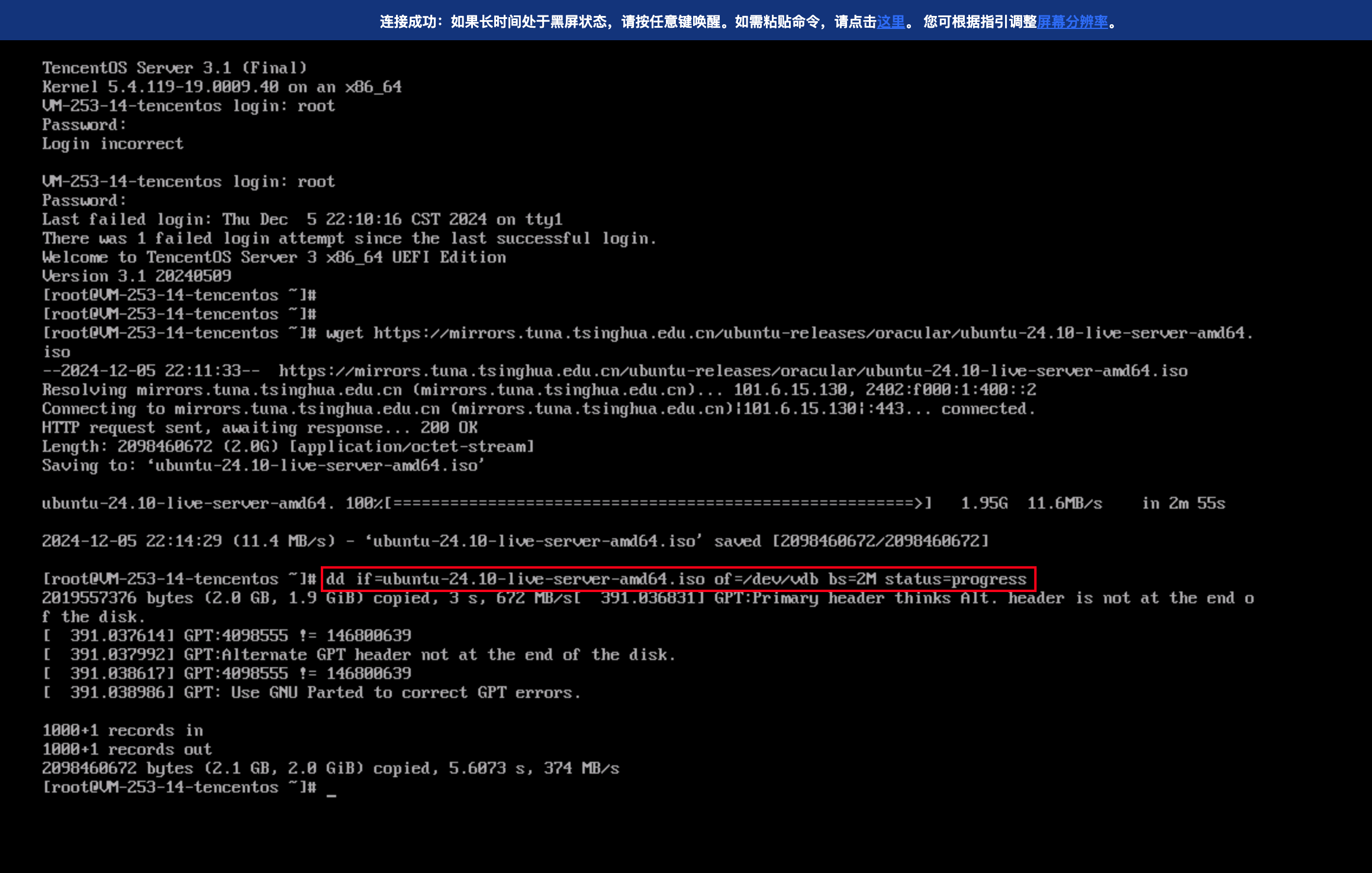命令将 ISO 写入数据盘。dd if=<ISO文件名> of=/dev/vdb bs=2M status=progress