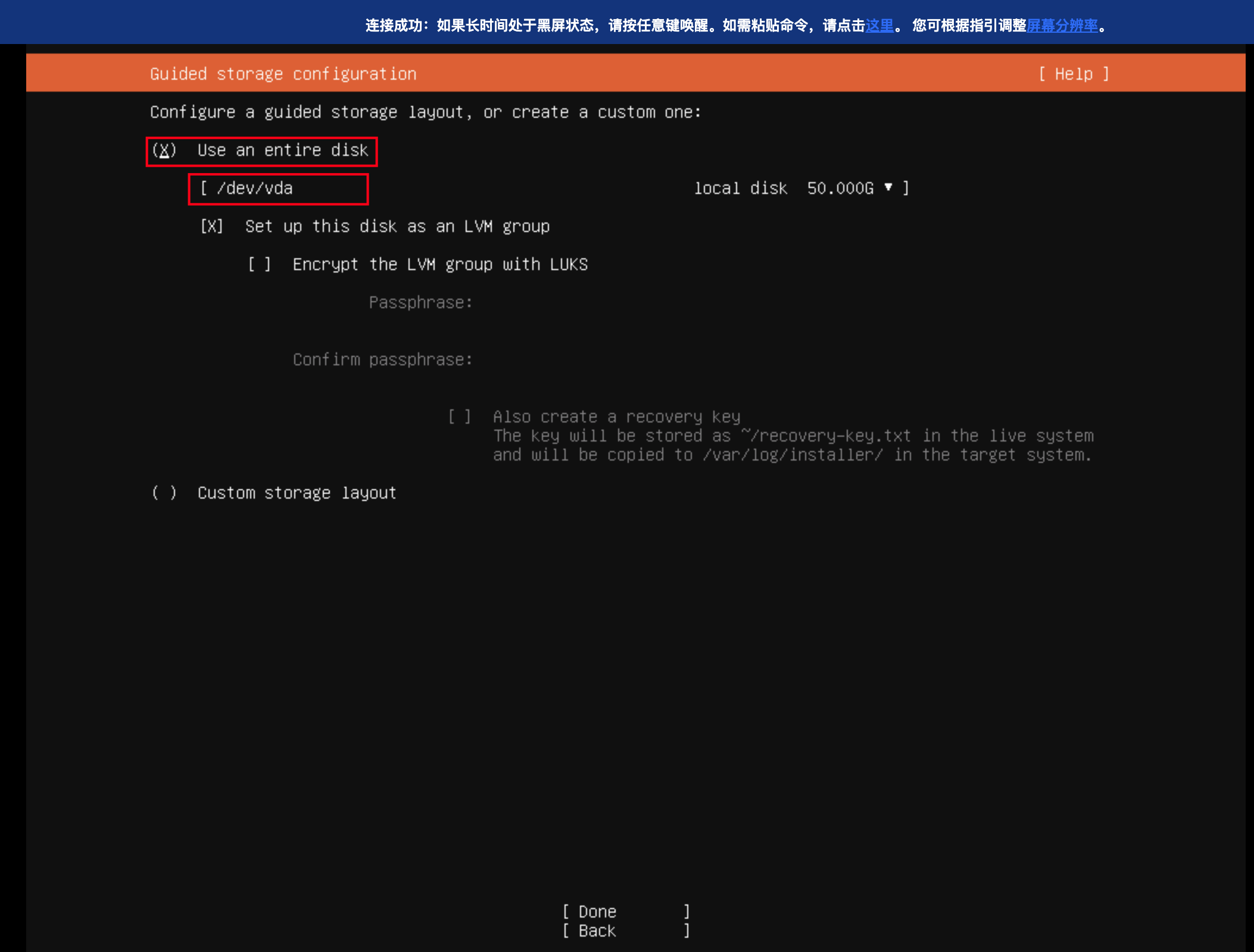 3. 使用 VNC 方式登录新创建的云服务器实例,将 ISO 系统安装到数据盘 vdb,同时设置 root 密码。