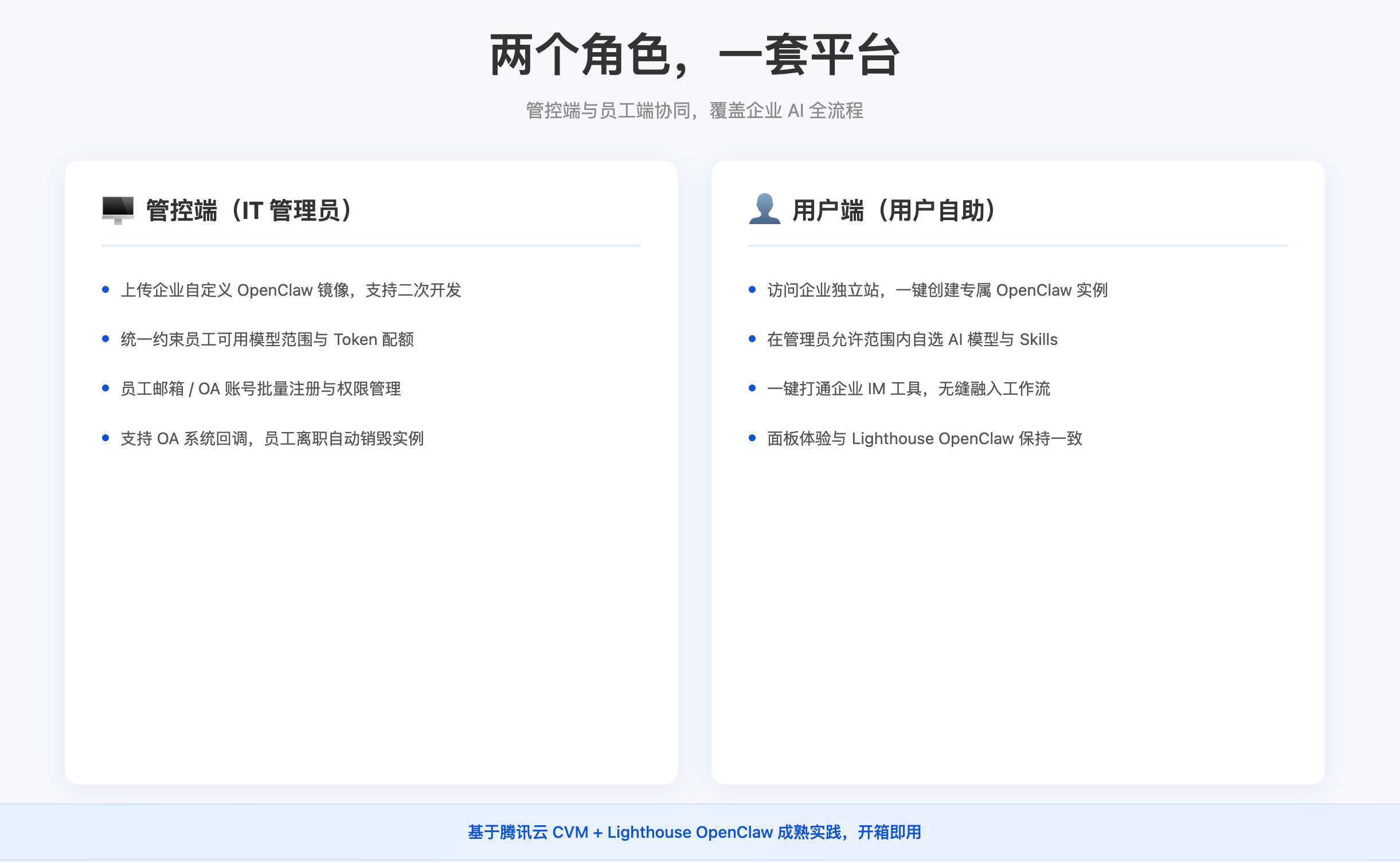 底层基础设施由腾讯云全托管,企业无需具备云原生技术及运维能力,10分钟即可完成企业级 OpenClaw 平台的部署,全程轻量化运营。
